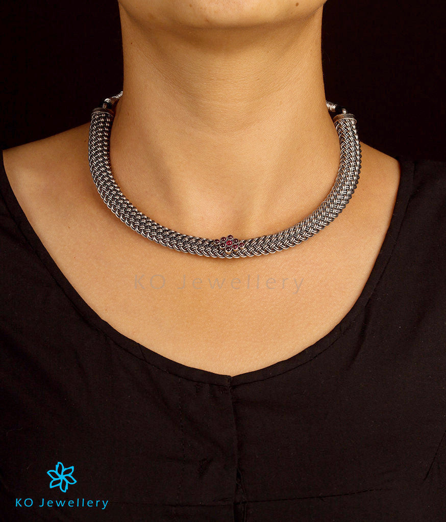 Grab everyone's attention with this amazing piece of jewellery. This is one piece which can be worn with the most traditional of outfits and with a chic evening gown too.This Sterling Silver (92.5%) oxidised necklace is in a choker design and sits very close to the neck; the design is a result of a masterful inter-weaving of silver which looks like a lovely mesh. Extra detailing is done with kempu stones. It is handcrafted using techniques used in ancient South Indian antique temple jewellery.