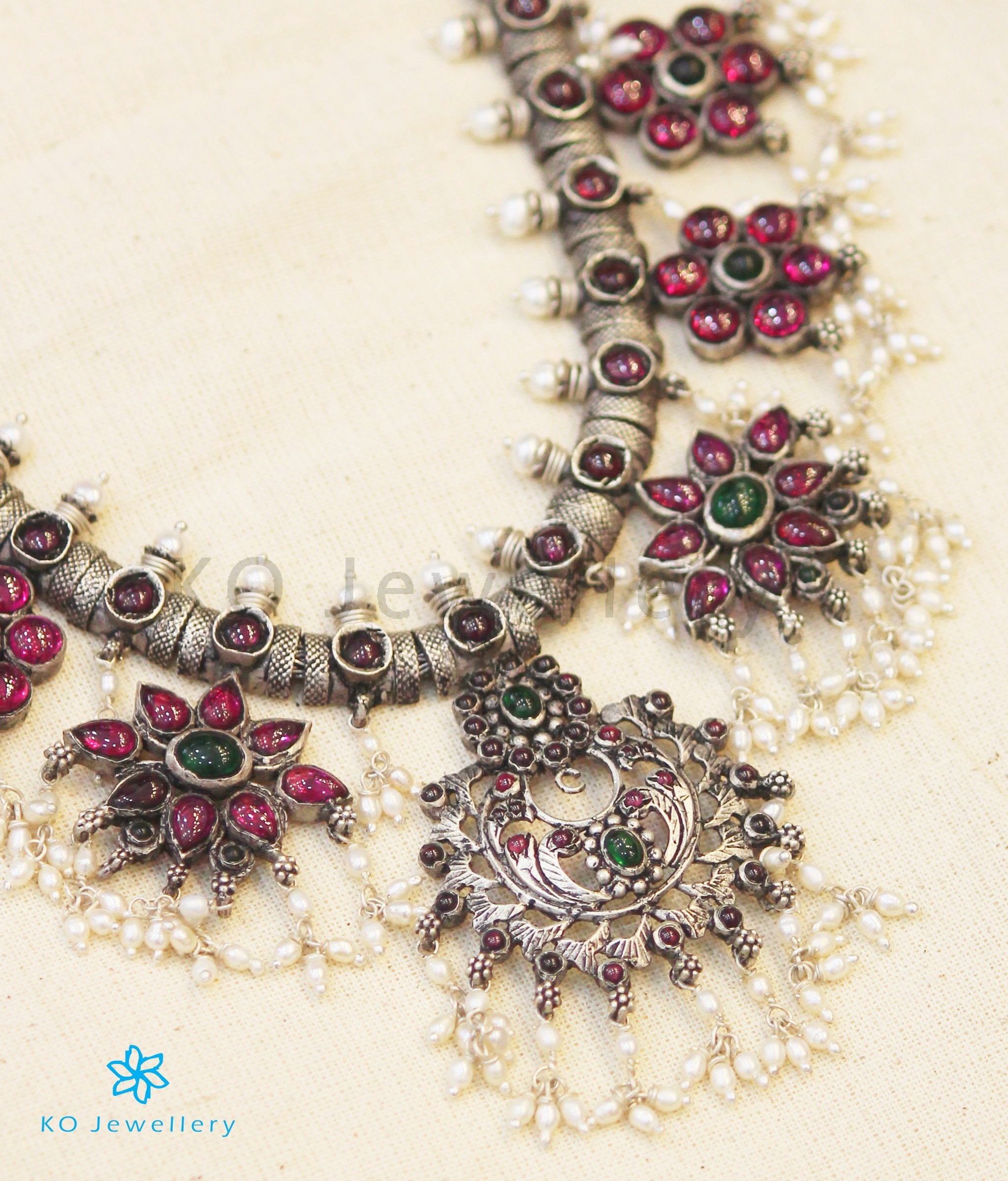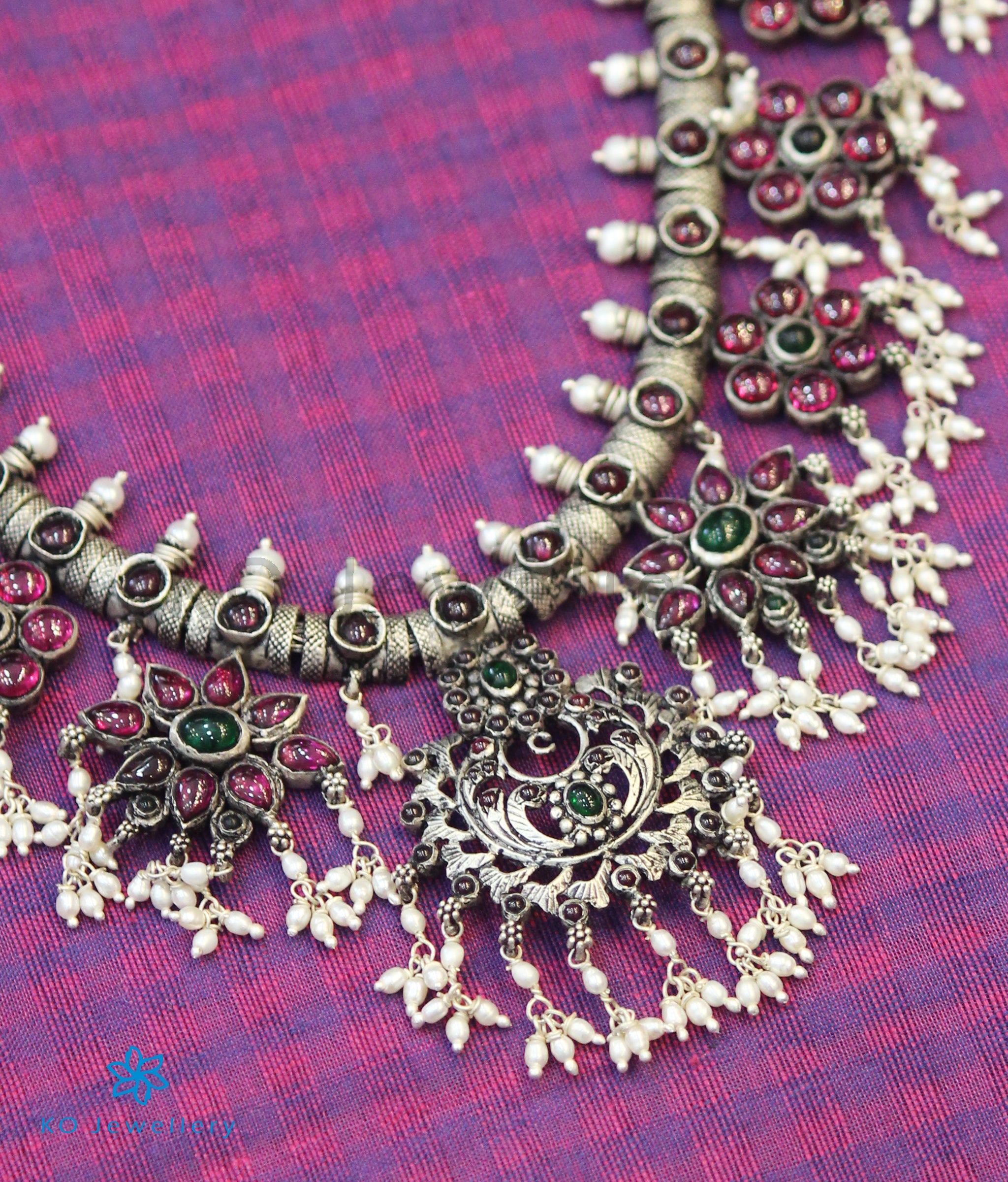 This guttapusalu necklace is a faithful reproduction of the traditional design of the necklace.Handcrafted in Sterling Silver (92.5%) with techniques, used to craft temple jewellery for centuries this necklace is a heirloom piece.This necklace is also available in gold-dipped finish.