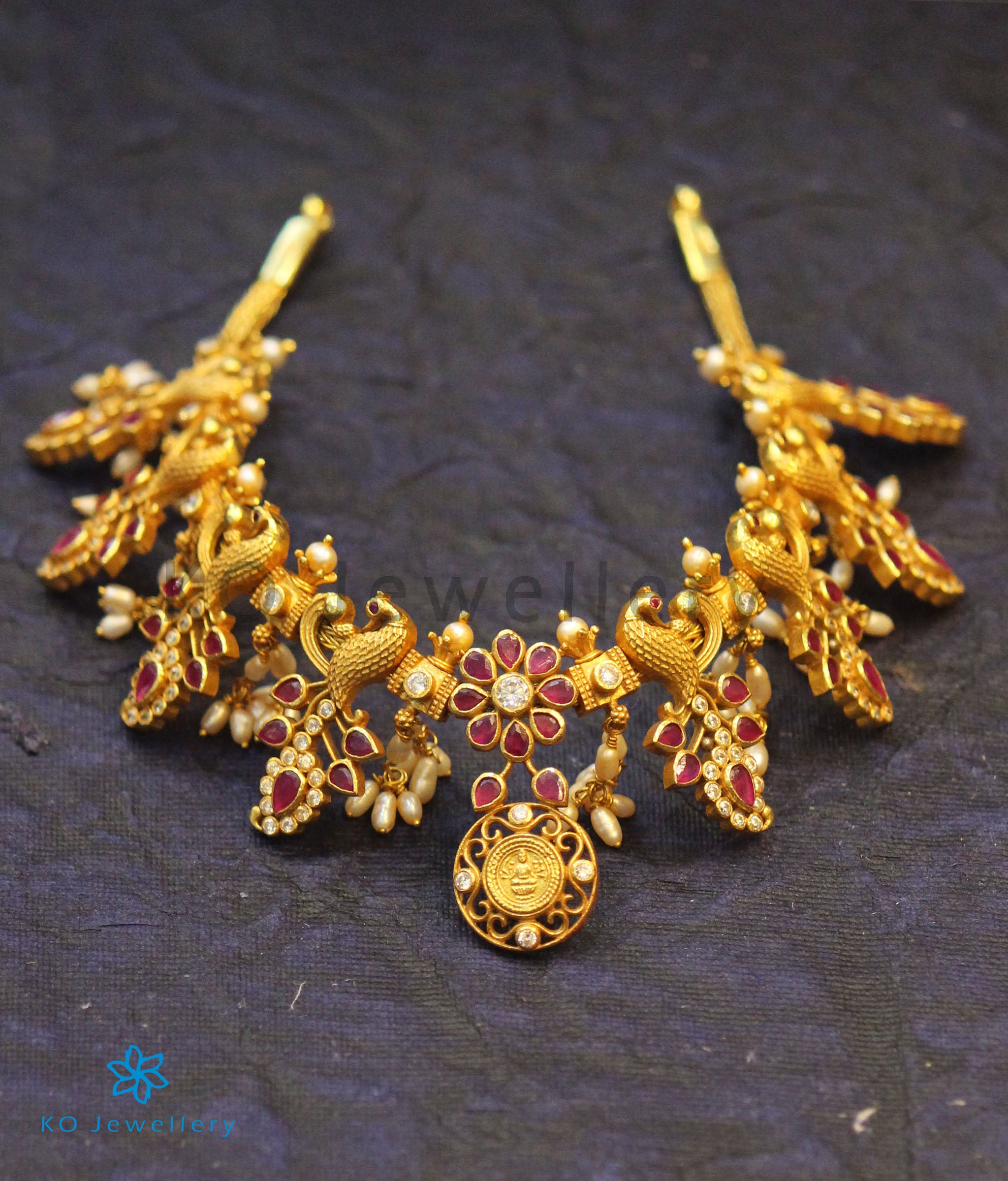 Crafted using techniques used in South Indian antique jewellery in Sterling Silver (92.5) the necklace has been gold-dipped to perfection. This piece is also available in the antique silver-finish.
