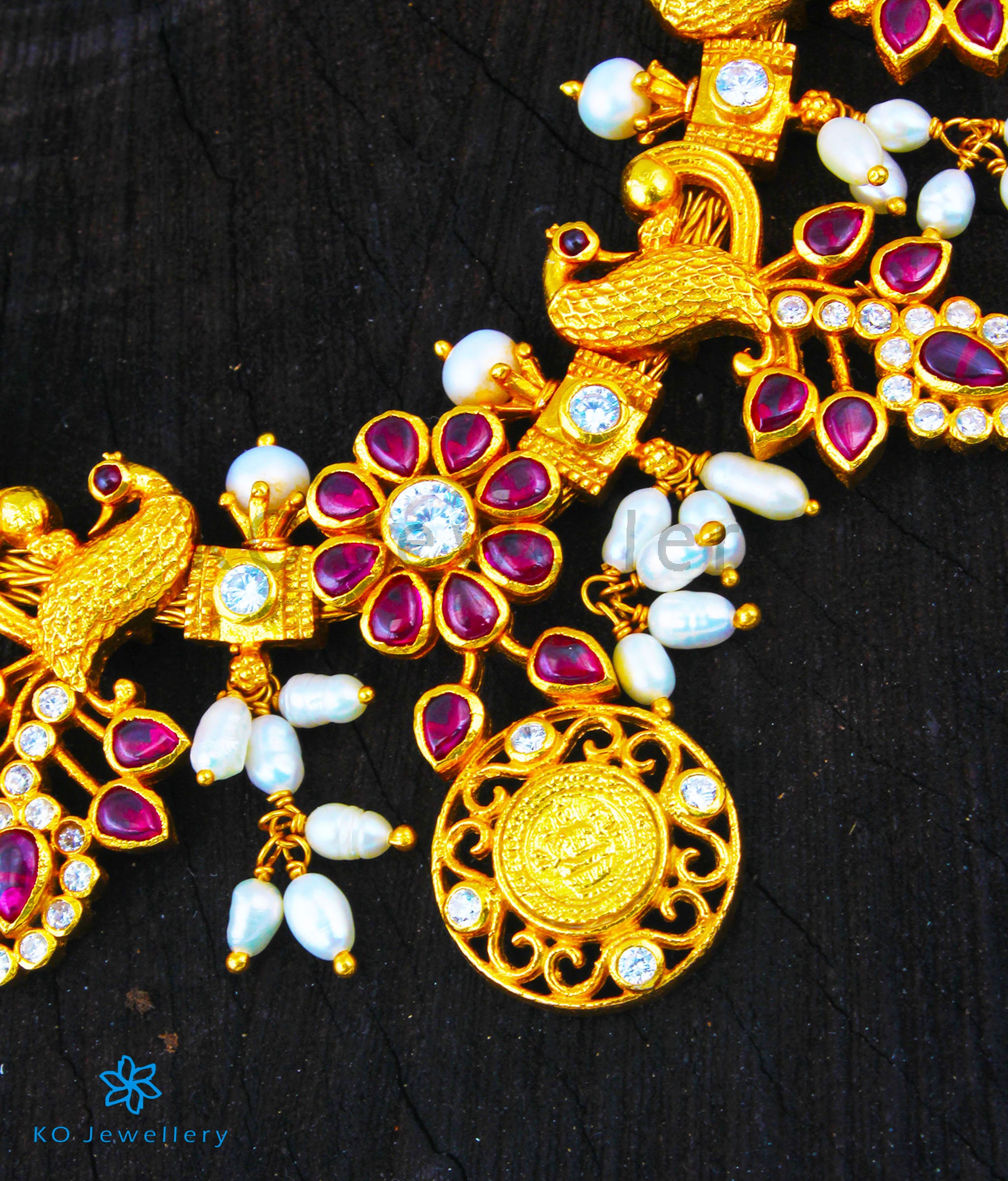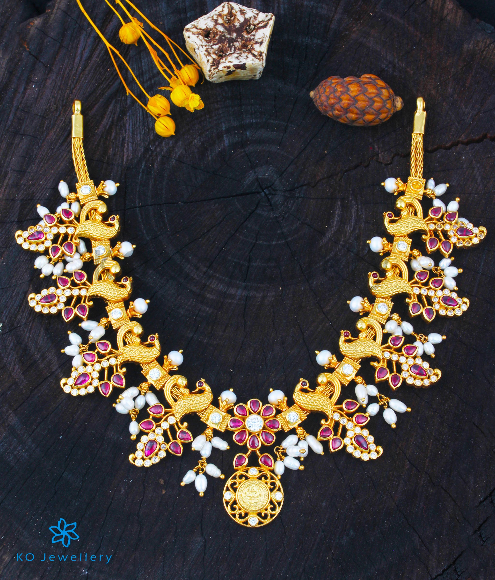 A stunning necklace with pretty peacocks and kempu stones this is an exquisite design .The skill and craftsmanship exhibited in this piece are truly amazing.