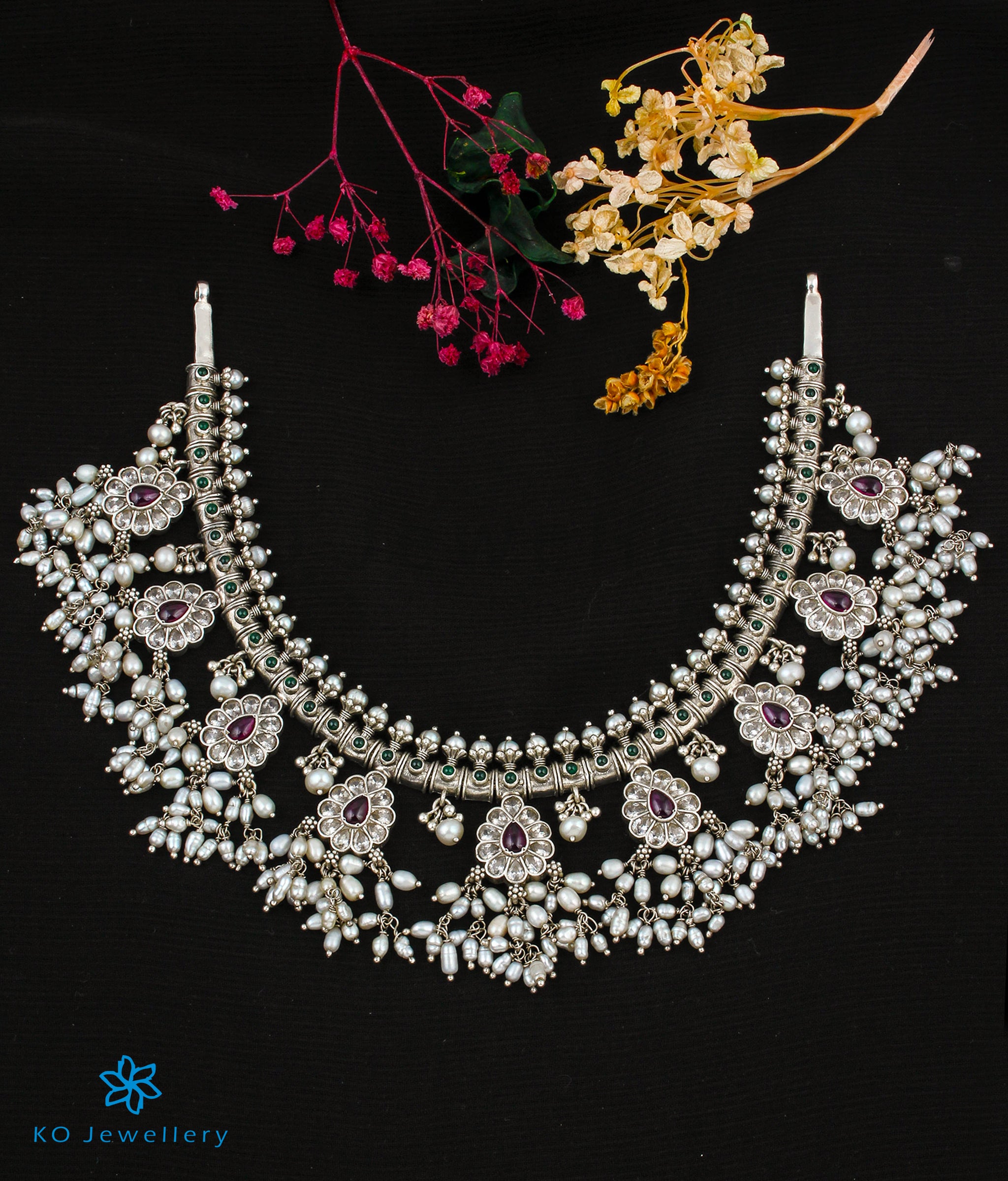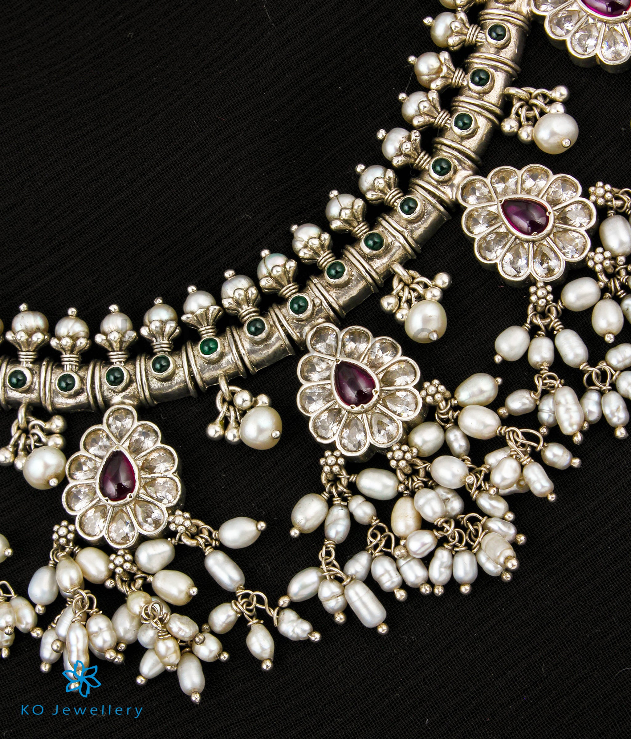 Handcrafted in Sterling Silver (92.5%) with techniques, used to craft temple jewellery for centuries this necklace is a heirloom piece. This necklace ia available in gold-finish on request.