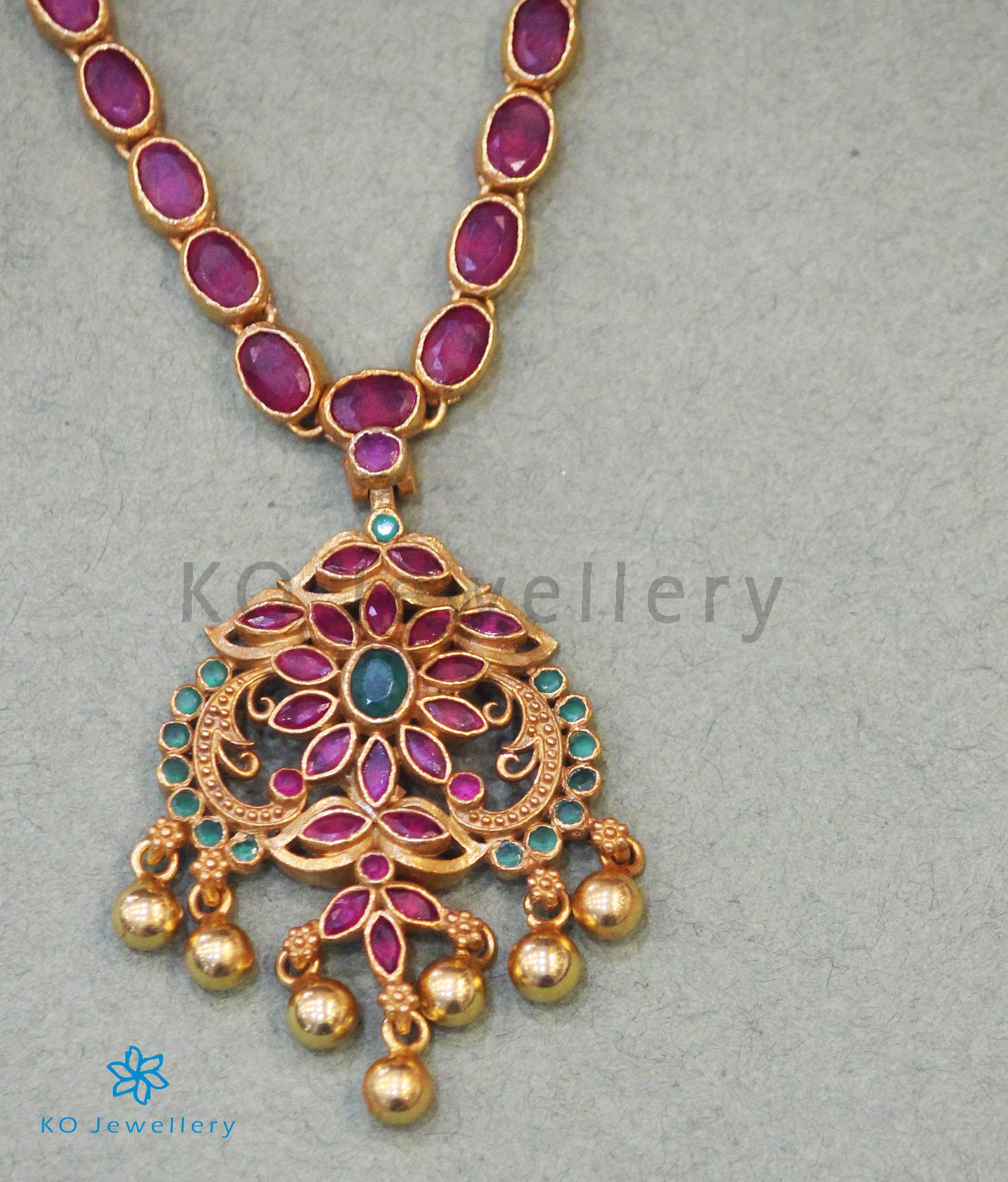 Floral in design this is a gorgeous traditional Sterling Silver (92.5%) necklace with attractive red and green kempu stones. Crafted using techniques used in ancient South Indian antique gold temple jewellery the entire piece is crafted in pure silver and dipped in 24 karat gold.