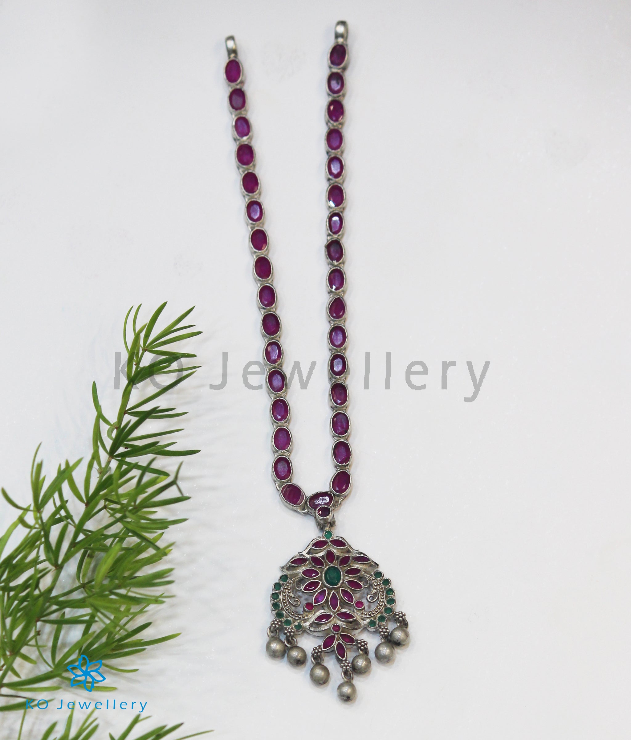 Floral in design this is a gorgeous traditional Sterling Silver (92.5%) necklace with attractive red and green kempu stones. Crafted using techniques used in ancient South Indian antique gold temple jewellery the entire piece is crafted in pure silver and oxidised.