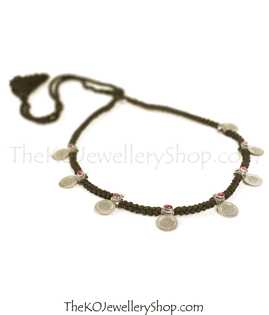 An iconic design, this light-weight traditional `Kasu malai' necklace is crafted by weaving silver coins into black thread.This is a reversible necklace which has a different design on both sides. On one side the coins carry the image of godess Laxmi (seated on a lotus) and display a single row of `kempu stones' ; on the other side we can see a beautiful parrot motif .The skill and craftsmanship exhibited in this piece are truly amazing.It comes with a pair of matching ear-studs.