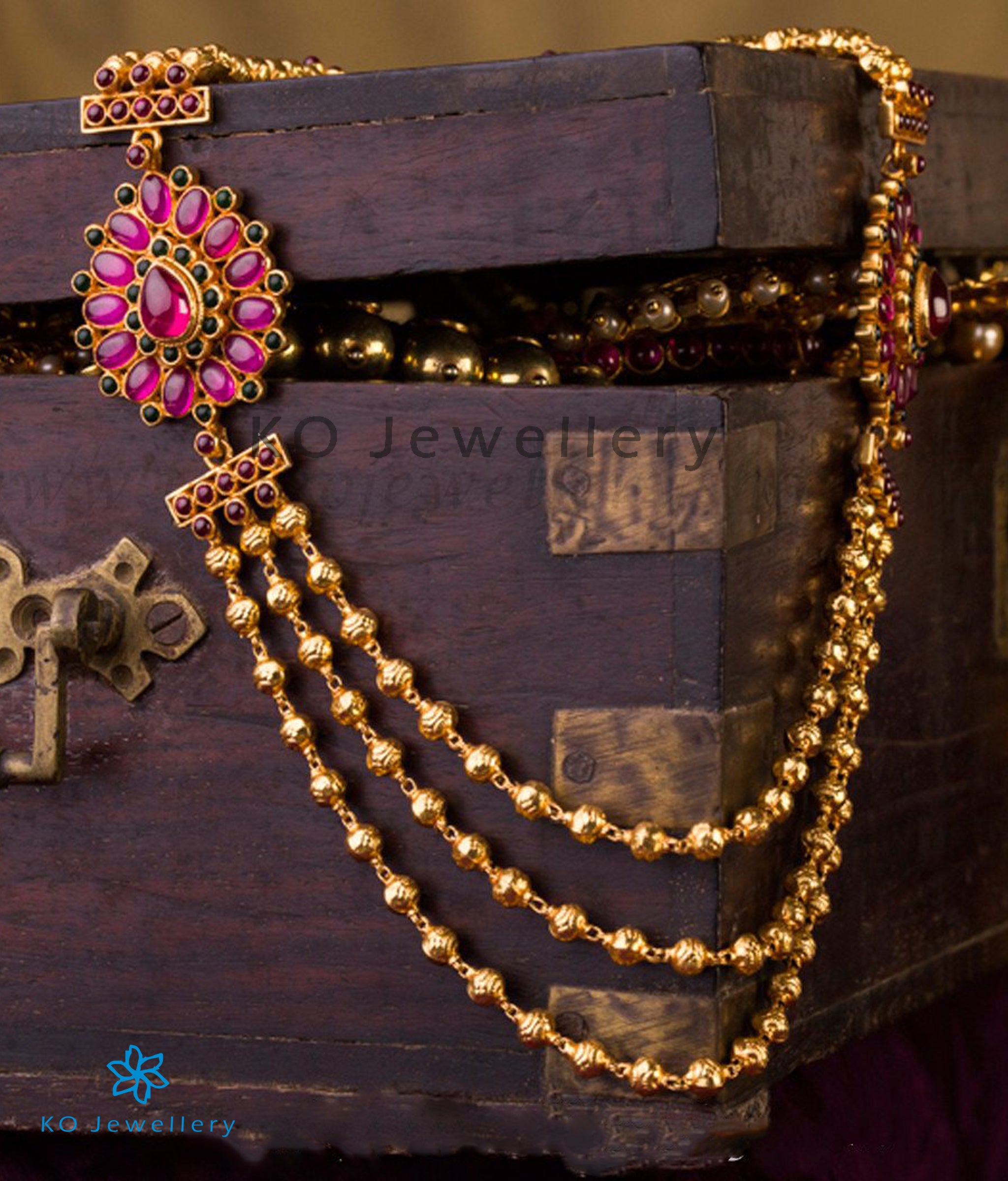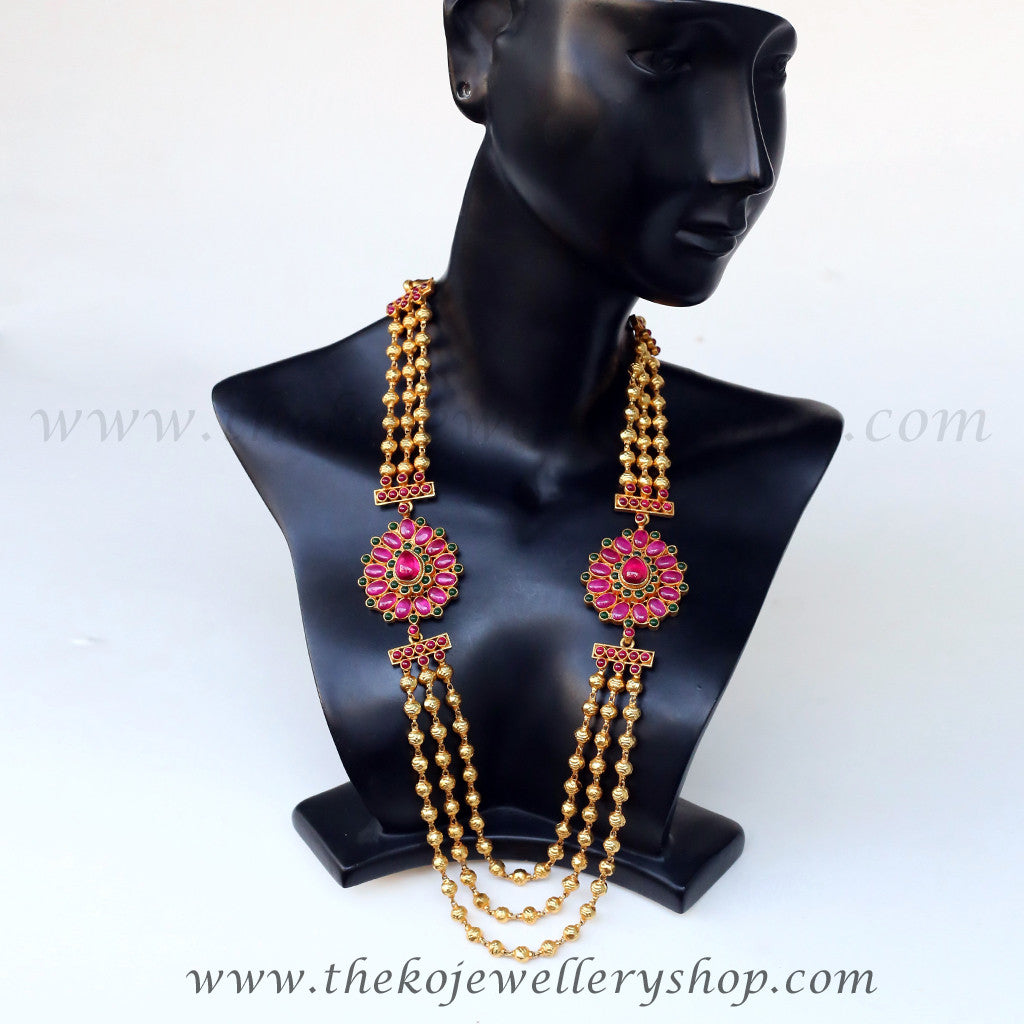 Fit to adorn a bride, this ornate three-line necklace is truly a head-turner.It has three lines of gold-dipped silver beads along with two beautiful pendants at the side interspersed with green.Part of the Temple Jewellery collection of KO this necklace presents a traditional design with a contemporary twist.Crafted using techniques used in ancient South Indian antique gold temple jewellery the entire piece is crafted in pure Sterling Silver (92.5) and dipped in 24 karat gold.
