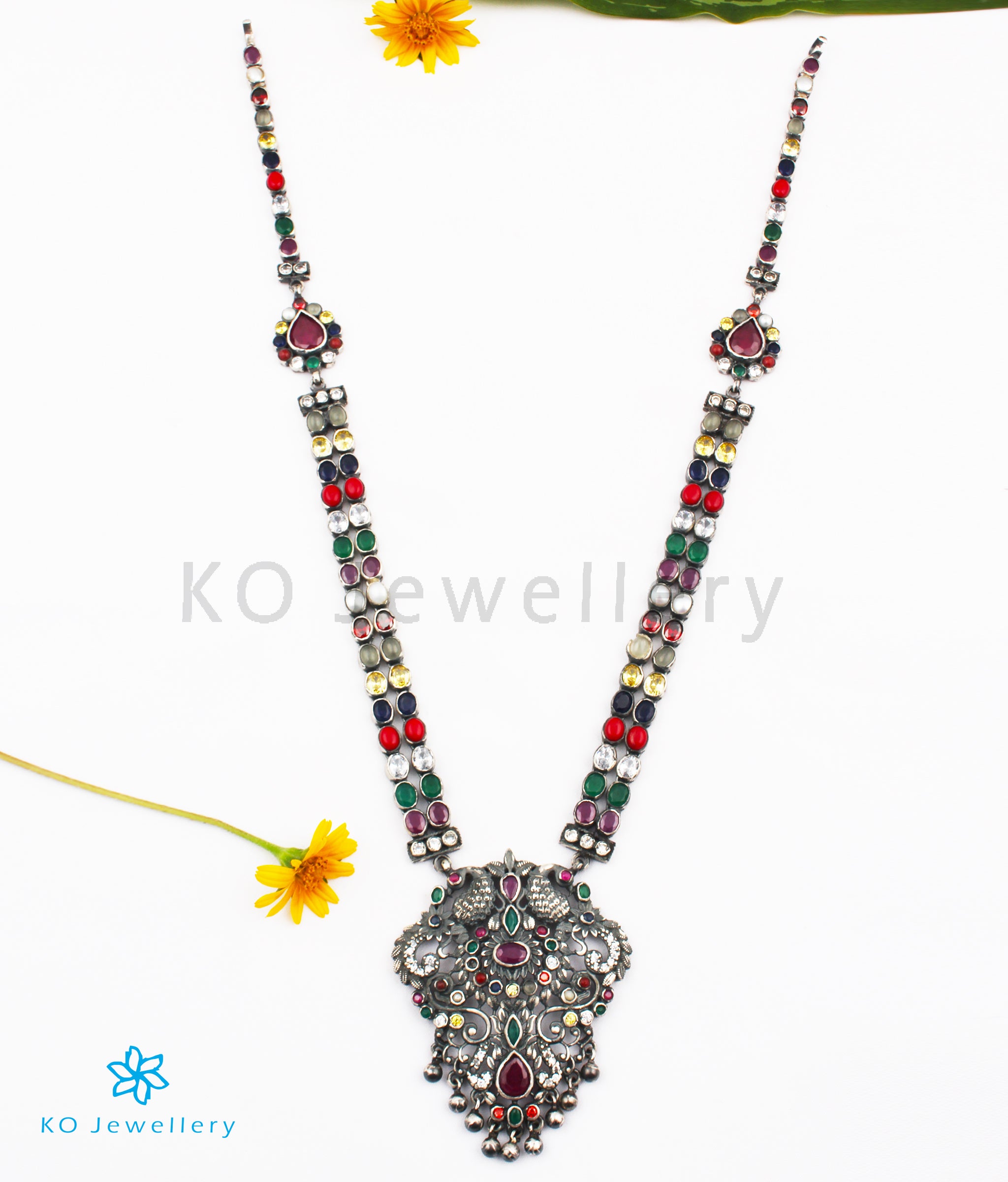Let the beauty and grace of the peacock surround you with this gorgeous; handcrafted Sterling Silver (92.5%) necklace studded with Navaratna stones.The necklace string is made of two layers of navaratna stones, while the pendant is topped by twin peacocks and an intricate design.