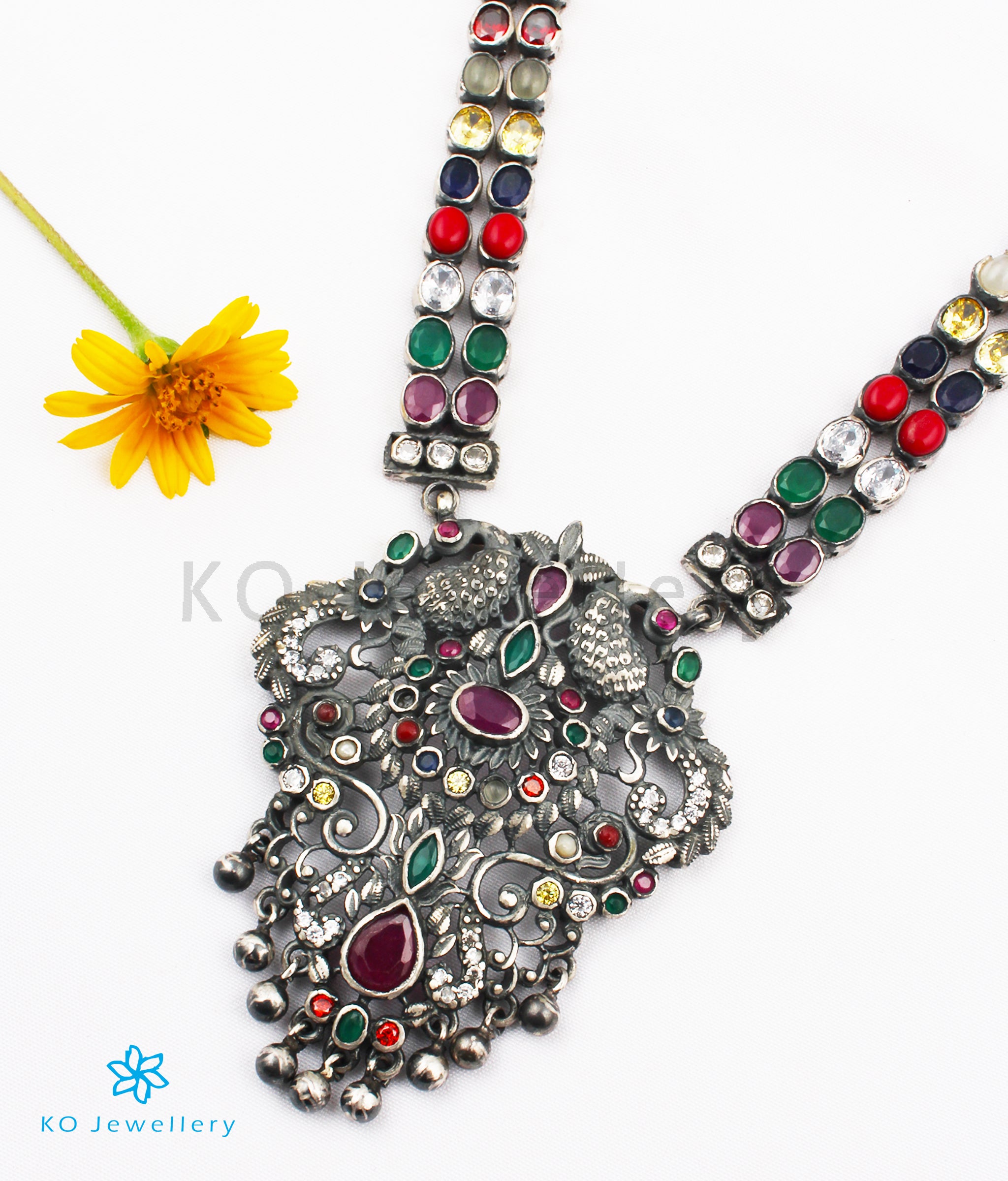 The Madhurya Silver Navaratna Peacock Necklace (Oxidised)