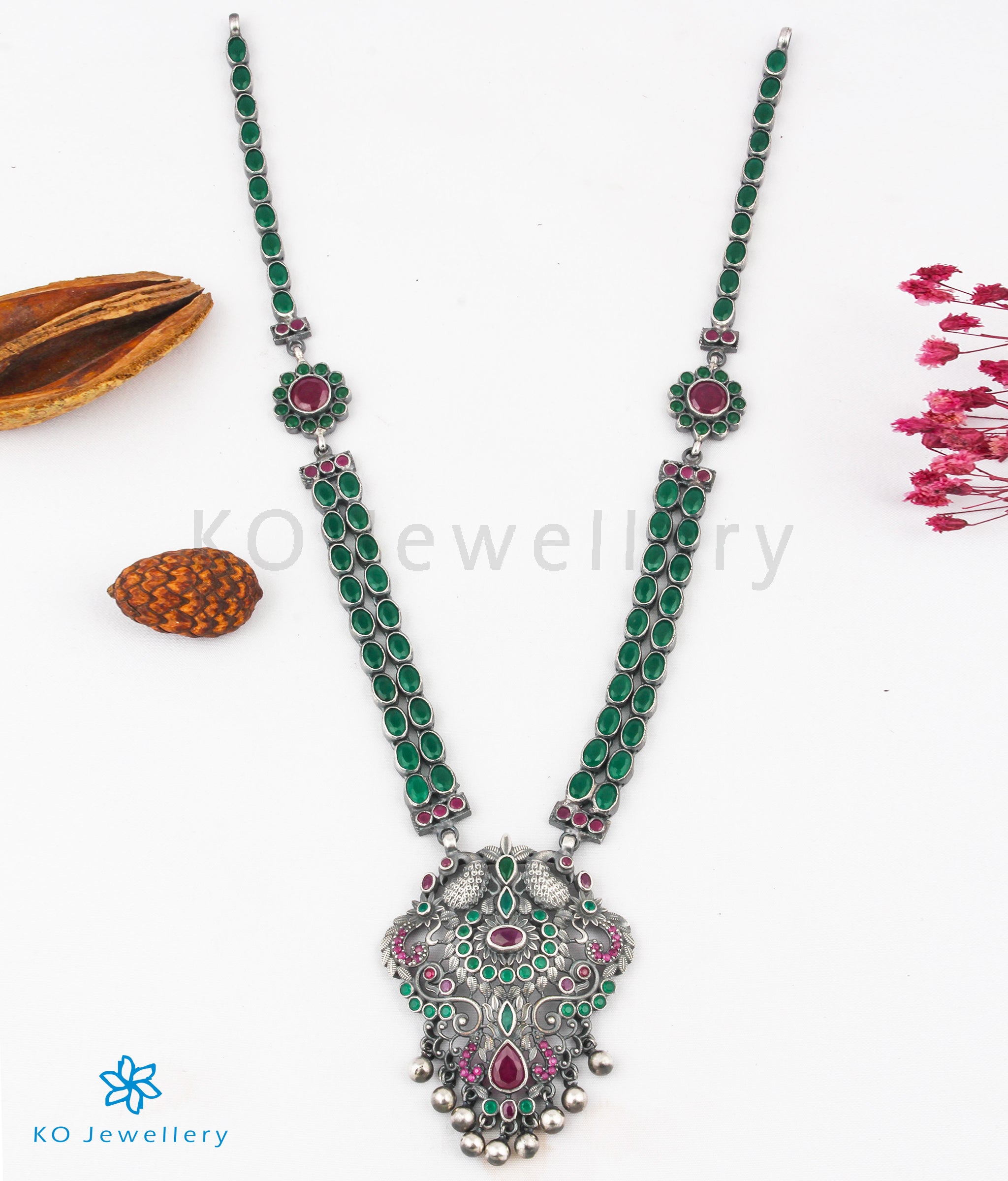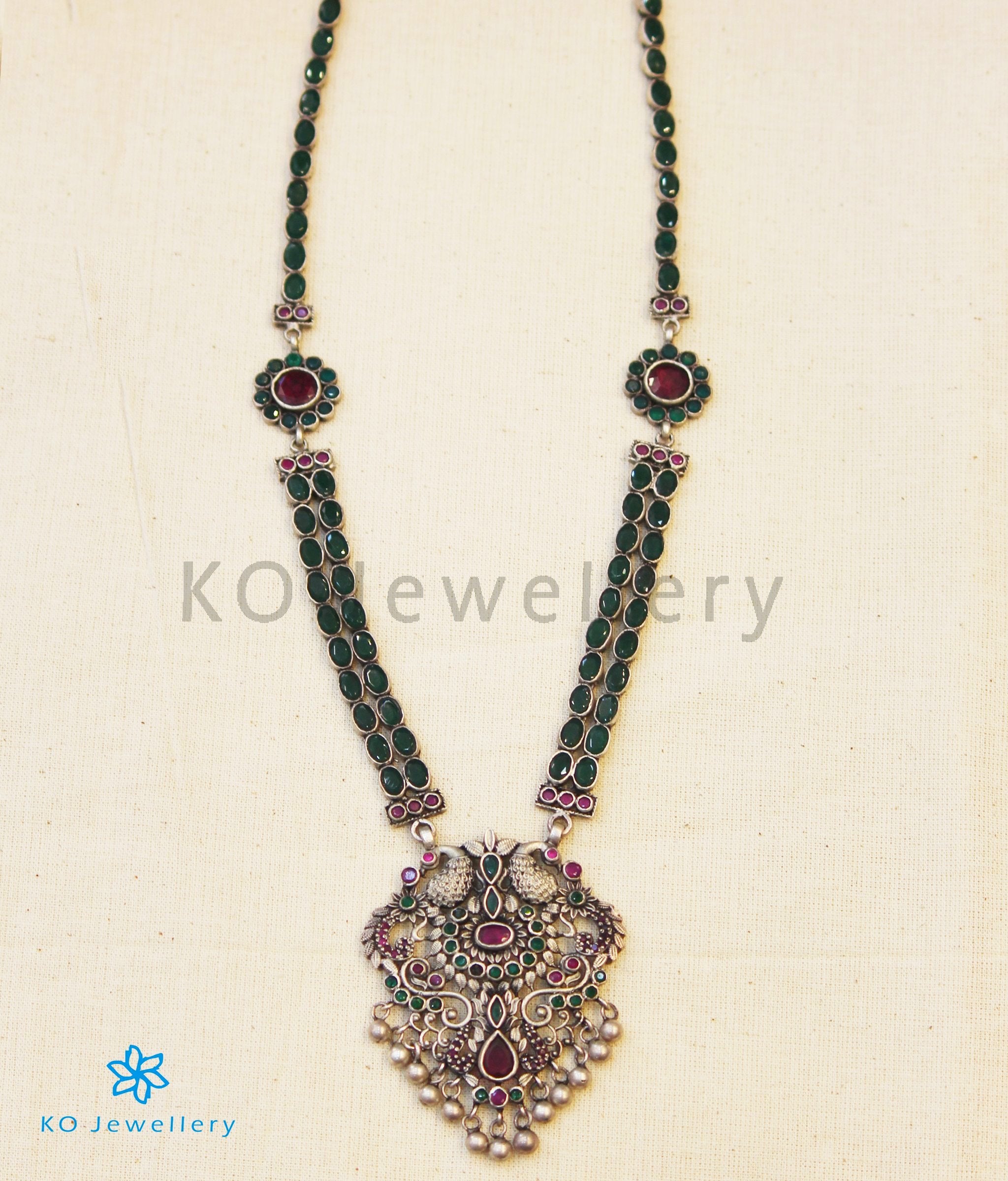 Let the beauty and grace of the peacock surround you with this gorgeous; handcrafted Sterling Silver (92.5%) necklace studded with kempu stones.The necklace string is made of two layers of green kempu stones, while the pendant is topped by twin peacocks and an intricate design of kempu stones.
