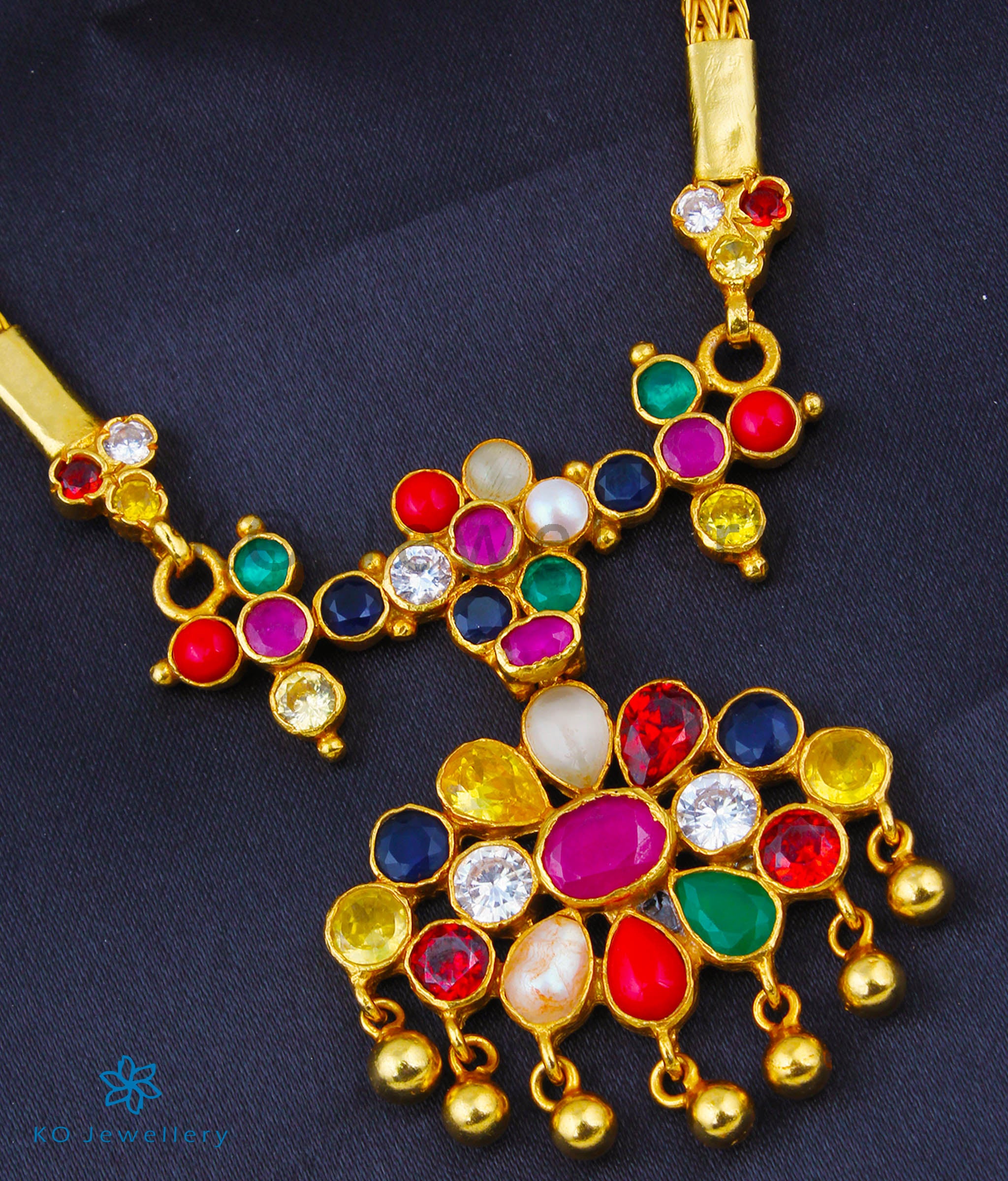 Catch everyone's attention with this beautiful Sterling Silver (92.5%) navratna or nine-gems necklace, which will match any oufit. Crafted using techniques used in ancient South Indian antique gold temple jewellery the entire piece is crafted in pure silver and gold-dipped.