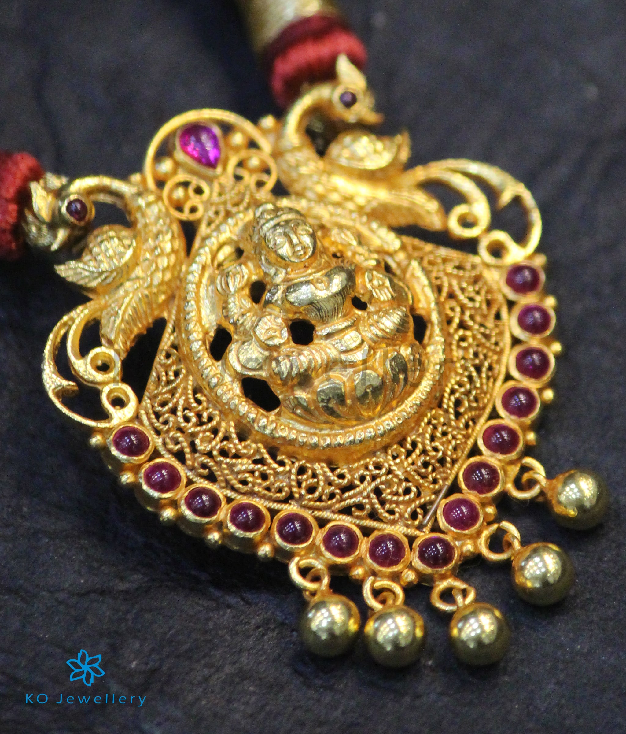 This is a traditional Lakshmi pendant with `nakkasi' or `nakshi' work (a form of gilt and repousse technique unique to south Indian temple jewellery).The Goddess is flanked by two peacocks on her side. All pieces in this collection are crafted in Sterling (92.5) Silver and gold dipped in a special process to give them an antique look. The necklace has been paired with matching kempu-stone earstuds.