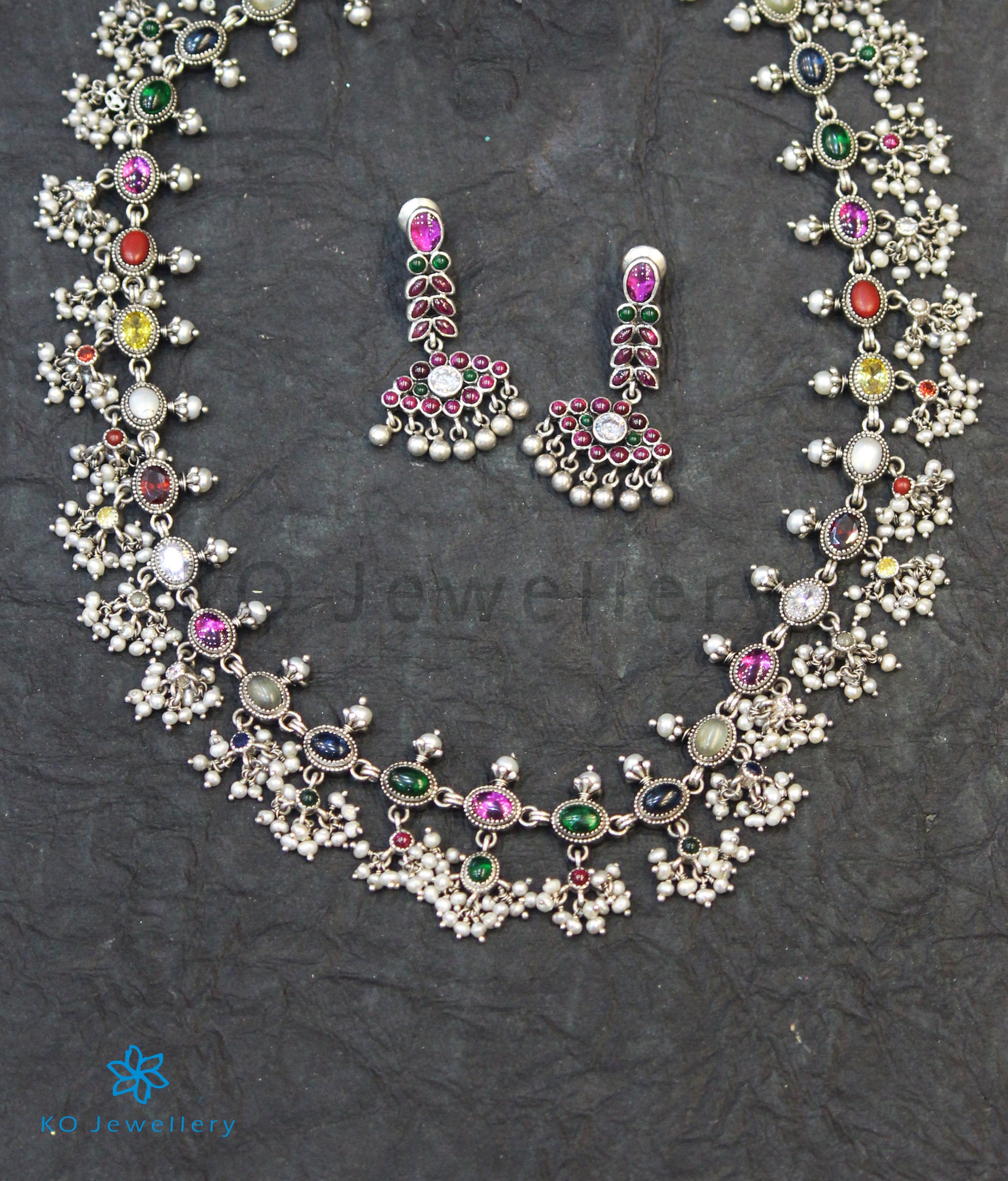 Catch everyone's attention with this beautiful Sterling Silver (92.5%) navratna or nine-gems necklace decorated with Pearls, which will match any oufit.Crafted using techniques used in ancient South Indian antique gold temple jewellery the entire piece is crafted in pure silver and oxidised.