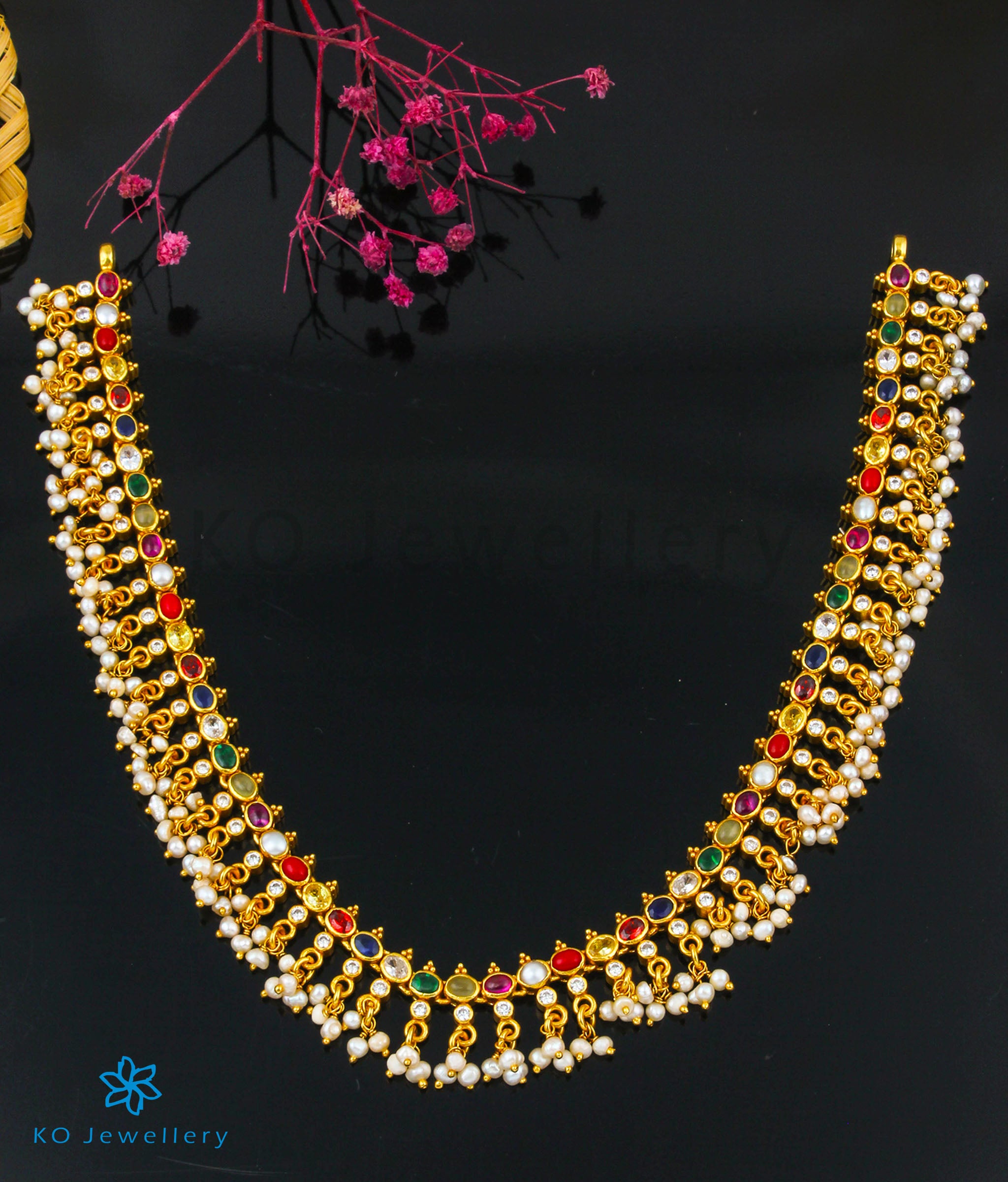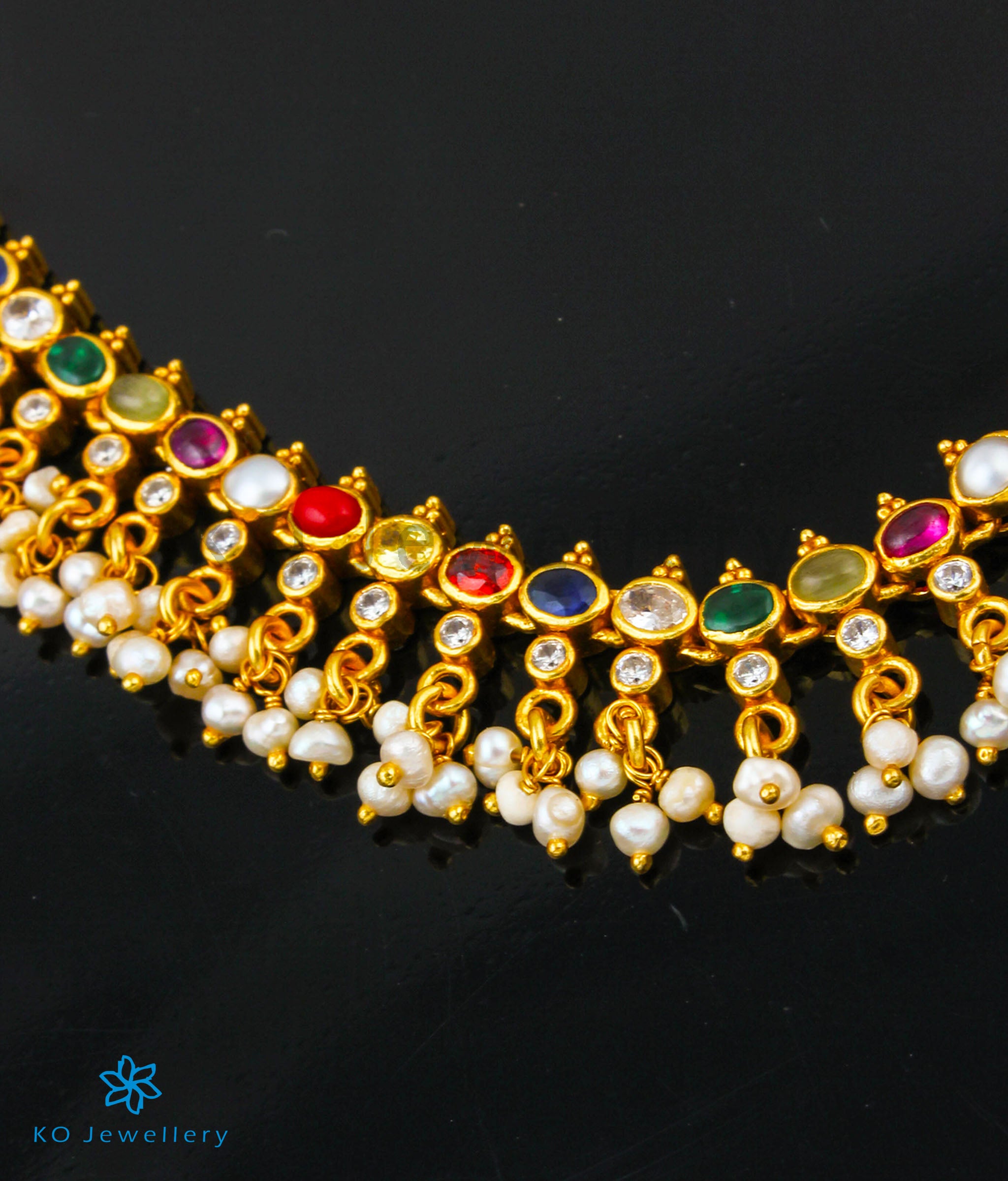 Gemstones used: Natural pearl, Cat's eye, Garnet, Recreated Coral, Zircon, kempu stone (also known as spinel or Zircon).