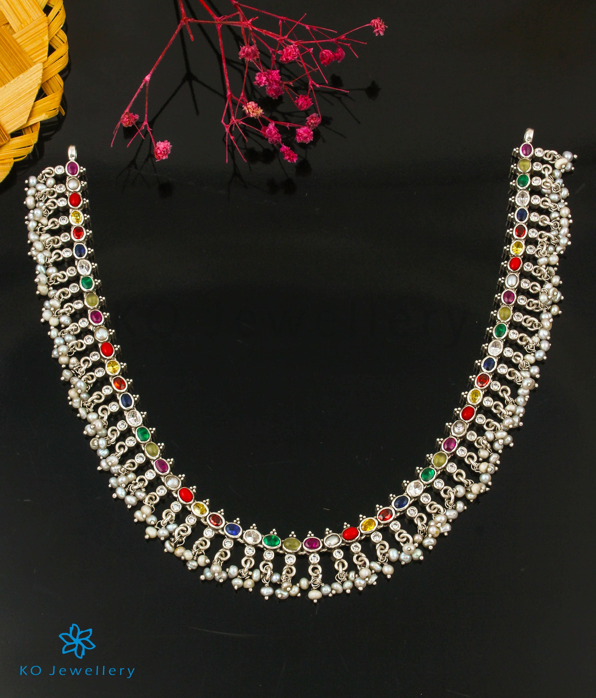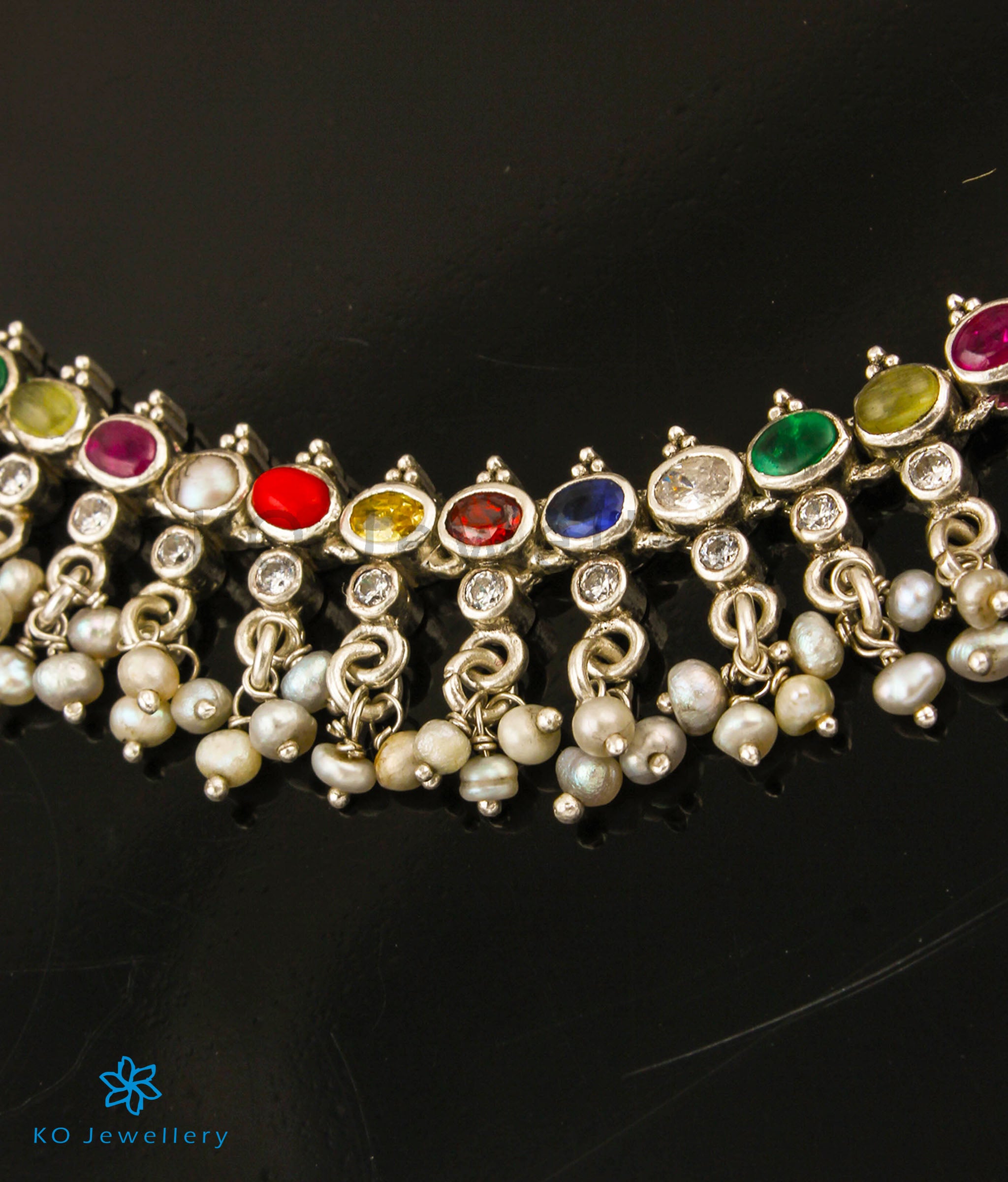 Catch everyone's attention with this beautiful Sterling Silver (92.5%) navratna or nine-gems necklace decorated with Pearls, which will match any oufit. Crafted using techniques used in ancient South Indian antique gold temple jewellery the entire piece is crafted in pure silver.
