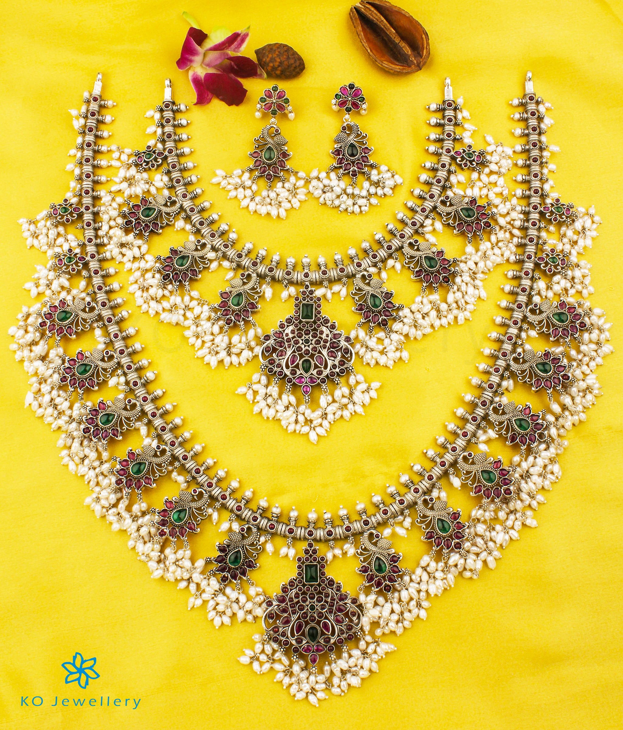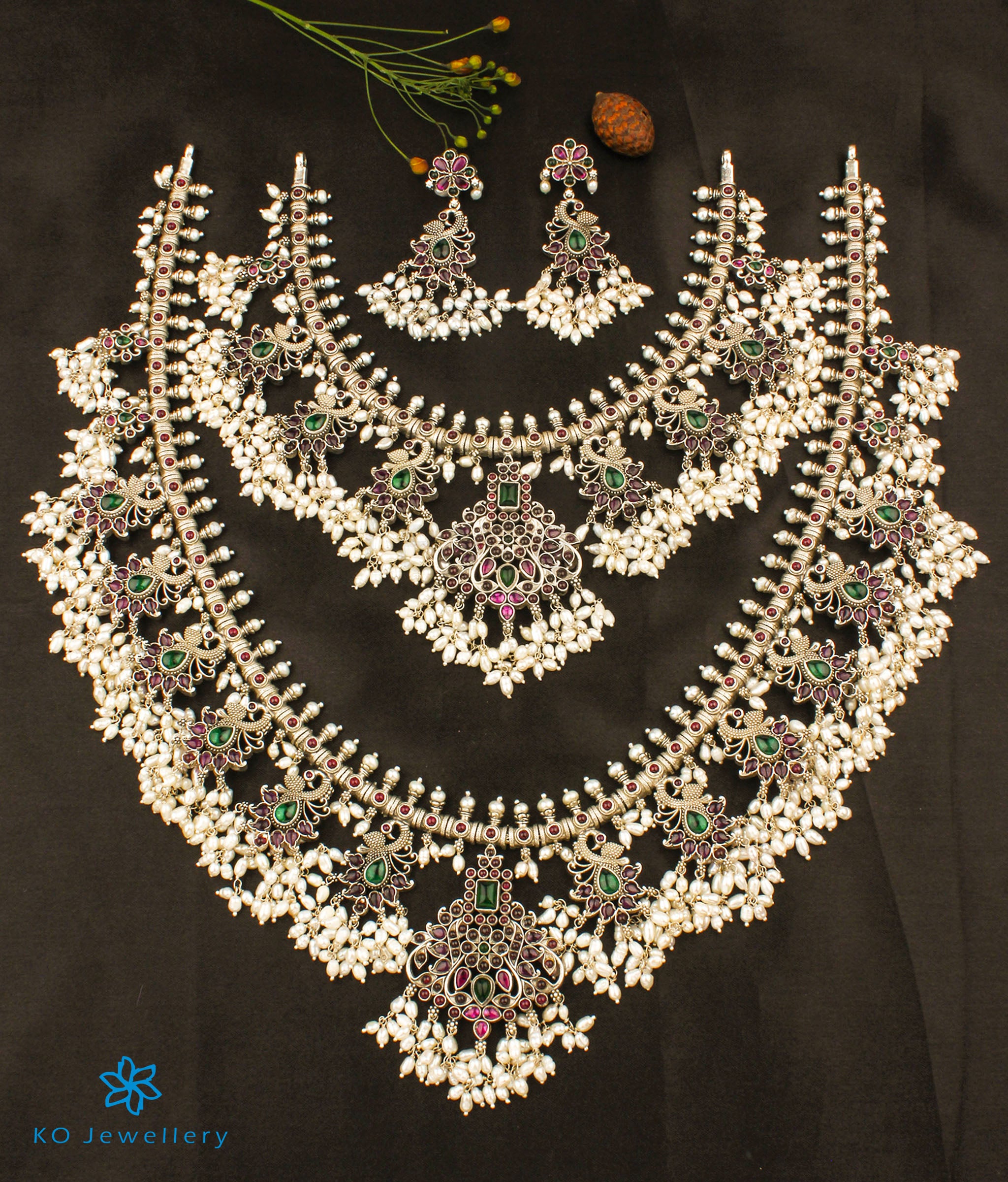 Celebrate the elegance of South Indian tradition with this Handcrafted 925 Silver Guttapusalu Necklace, a stunning piece inspired by the heritage of the Coromandel Coast. Crafted with meticulous attention to detail, this necklace features premium pearls and intricate peacock motifs, symbolizing grace and beauty. The symmetrical design enhances the classic guttapusalu style, making it a perfect choice for those who appreciate fine craftsmanship and timeless elegance. And wearing two necklaces of the same design, one which is shorter and the other that is longer is also a tradition. So here you can buy a set of these one long and one short.