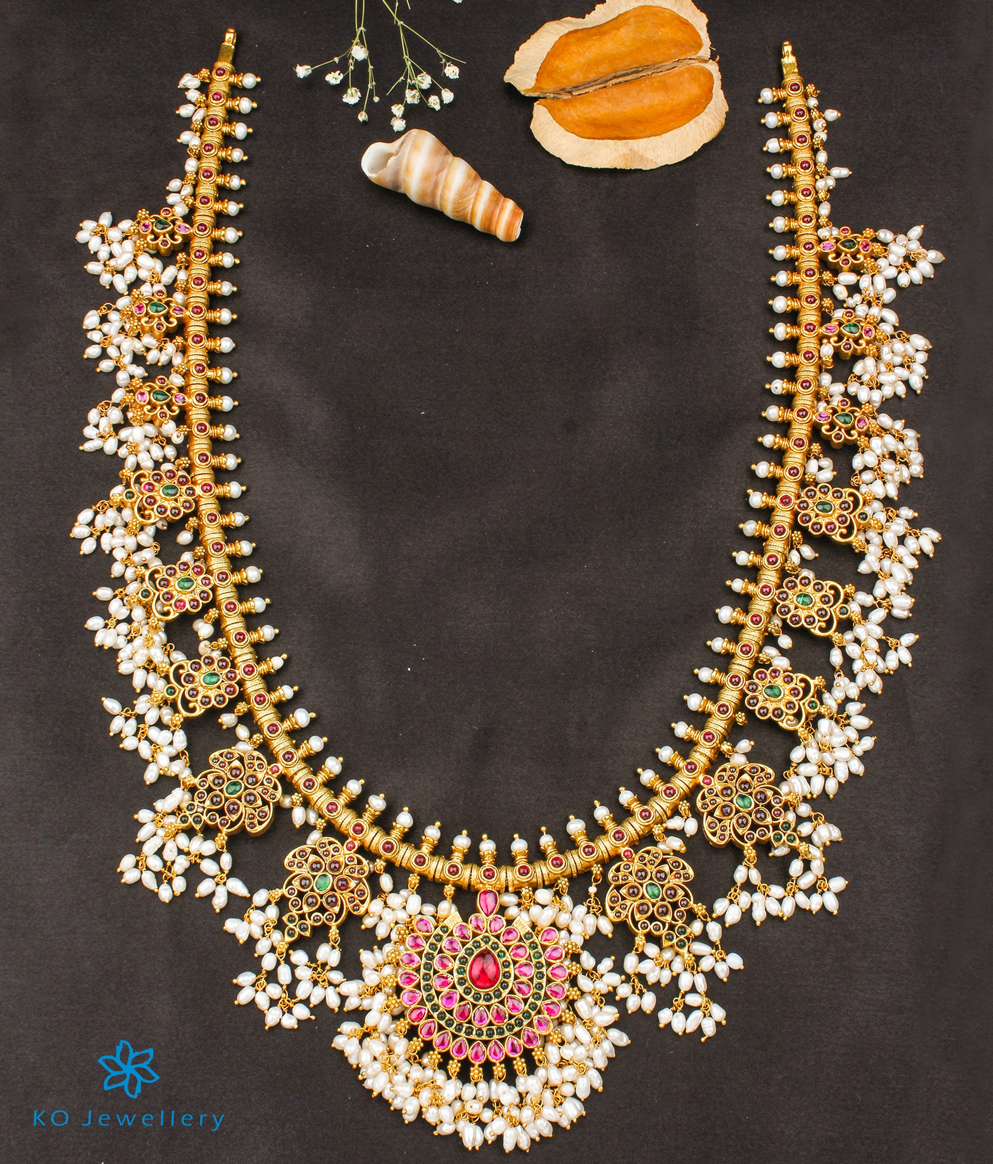 Wear a gorgeous design on your neck with this Pearl and kemp stone guttapusalu that has a central Lakshmi pendant. The Gutta Pusalu is a classic design from Andhra Pradesh and is named so because the necklace is fringed with bunches of small pearls very similar to "a shoal of small fish" (gutta) .Pusalu means "beads" and this design originated in areas close to the ancient pearl fisheries along the Coromandel coast of India.