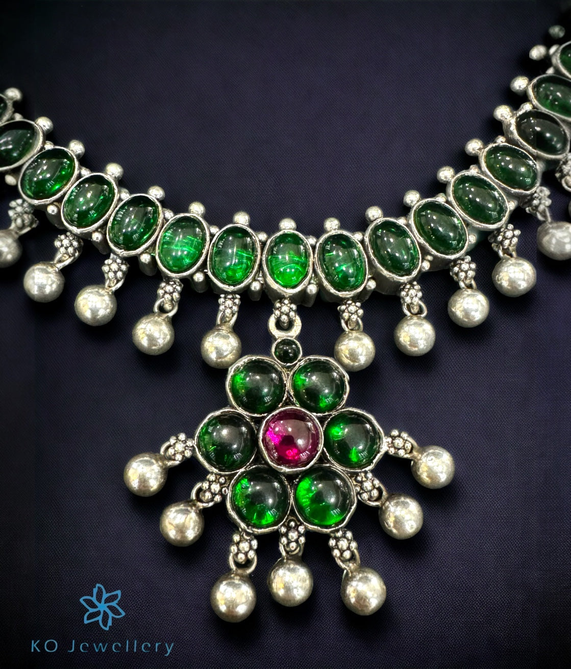 A classic design of south Indian temple jewellery this necklace has green kempu stones set singly in a closed setting. Called an `Addige' this necklace is crafted in Sterling Silver (92.5%) using techniques used in ancient South Indian antique gold temple jewellery.