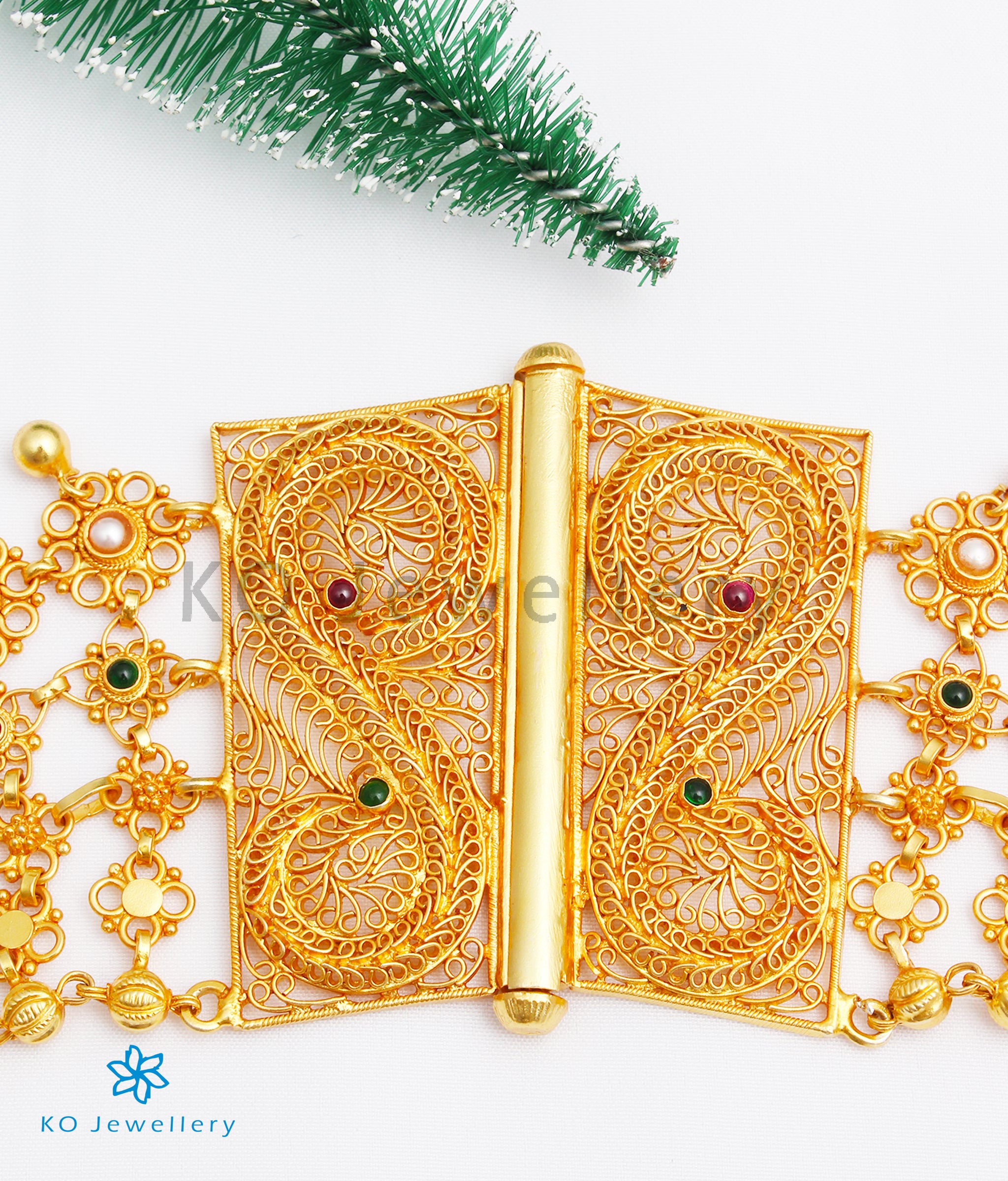 The name says it all , this is a necklace that was crafted for a Queen. A delicate necklace combining the technique of filigree and granulation this piece of jewellery is truly awe-inspiring! Crafted in Sterling Silver (92.5%) it is studded with tiny stones of Onyx and pearl it is held together by an intricately engraved clasp. A bigger version of this necklace is also available on request see here The Rani-Haar Silver Necklace.