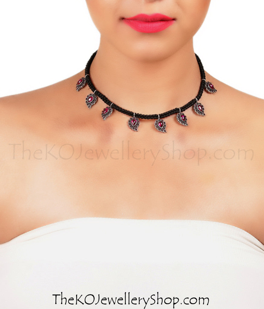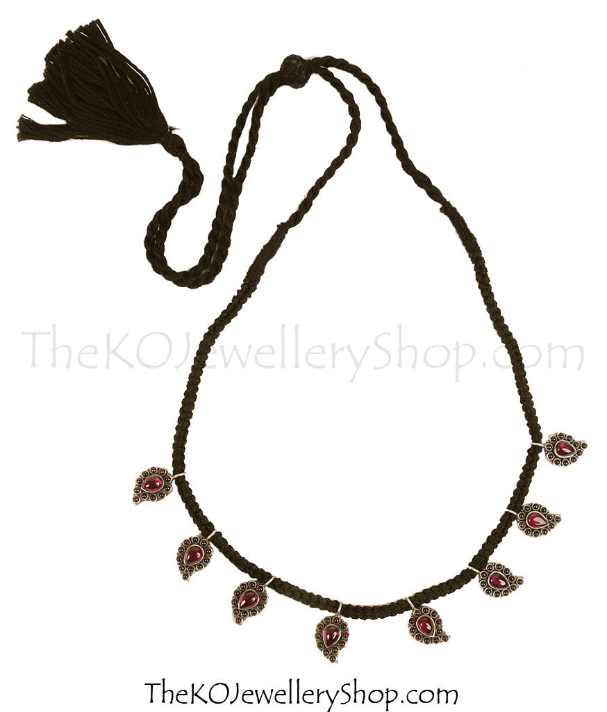 Old techniques combine with contemporary design in this pretty Paisley-motif necklace.The dainty handcrafted, Sterling Silver (92.5%) mango-shaped pendants studded with kempu stones are woven into black cotton thread.If you like designs that are unique, this piece is for you.