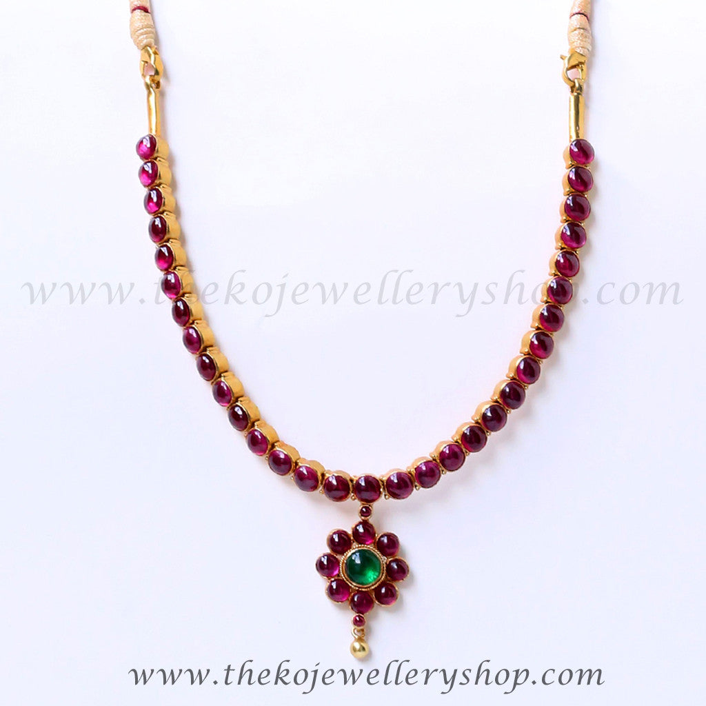 A classic design of south Indian temple jewellery this necklace has red kempu stones set singly in a closed setting. This necklace is crafted in Sterling Silver (92.5%) using techniques used in ancient South Indian antique gold temple jewellery.