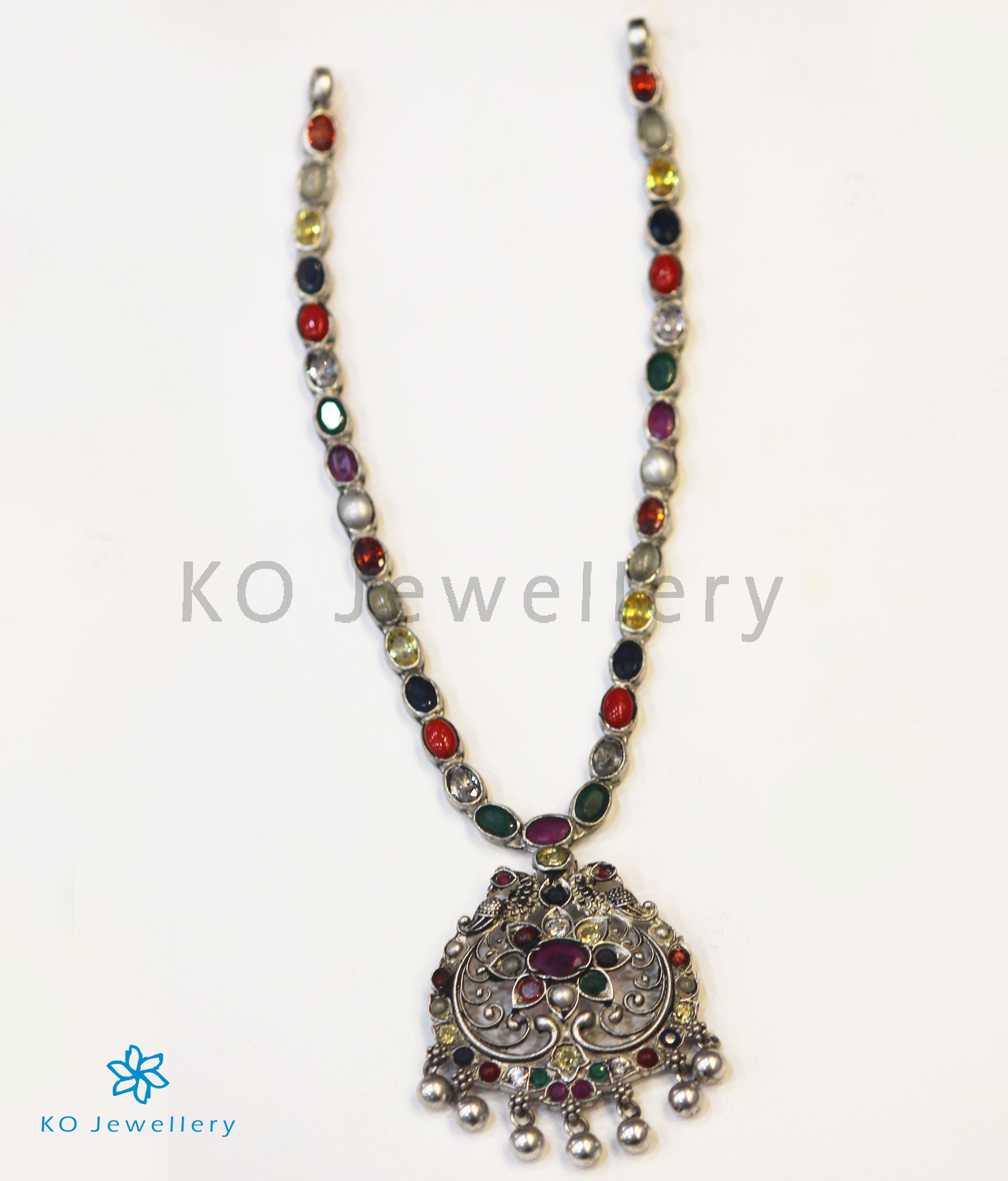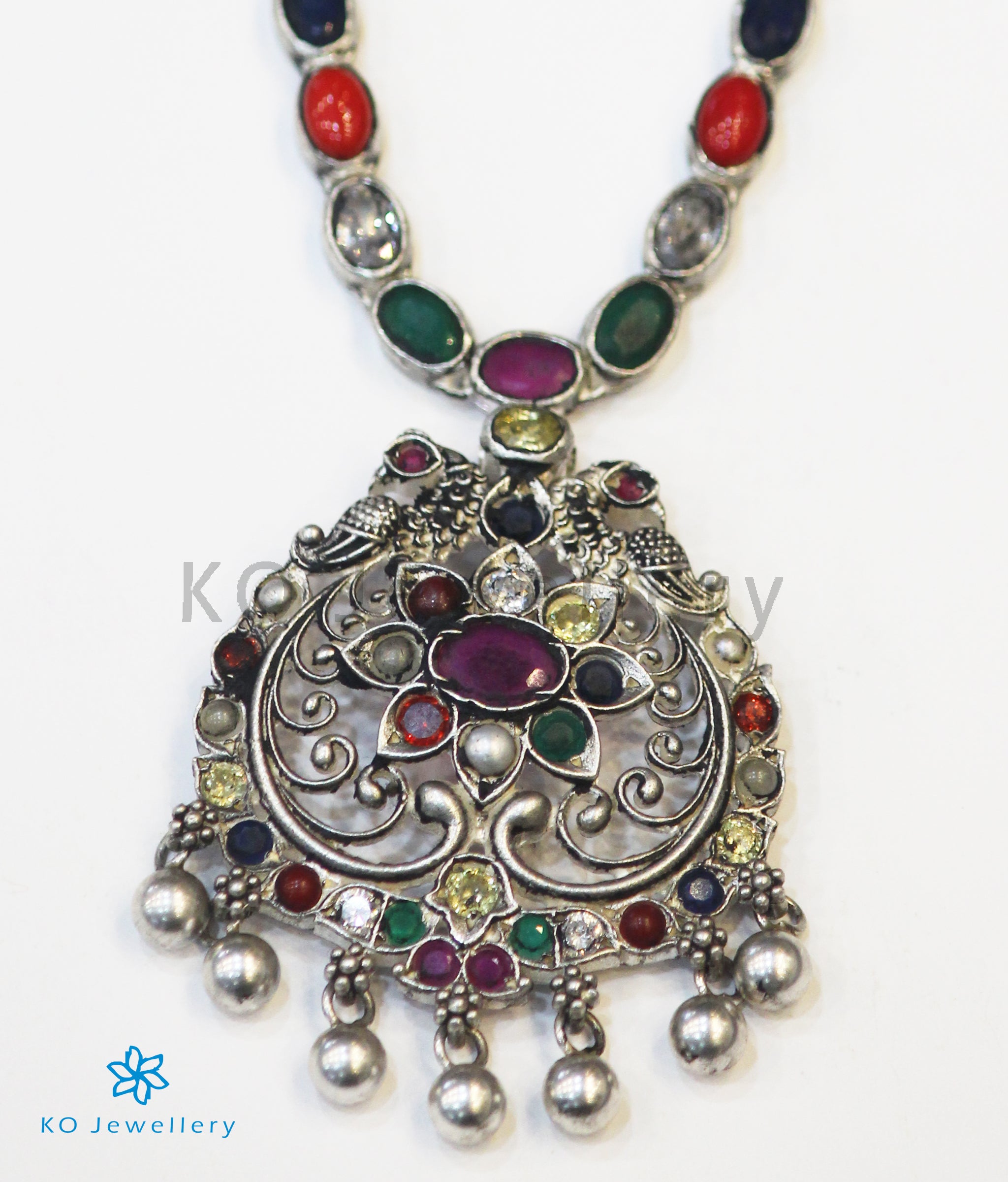 The Sachi Silver Peacock Navaratna Necklace (Oxidised)