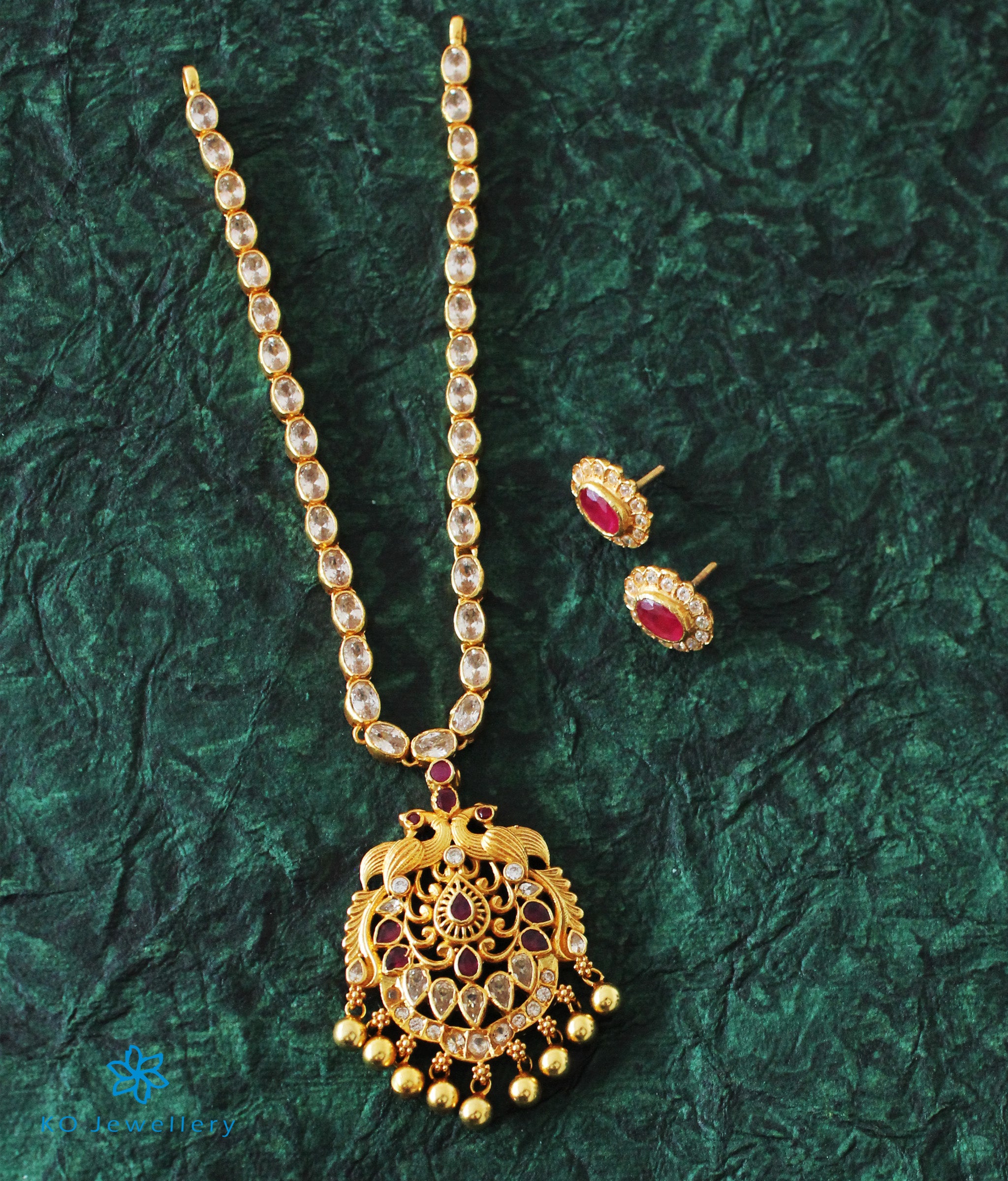 An attractive handcrafted Sterling Silver (92.5%) necklace studded with kempu stones the pendant of this necklace is topped by twin peacocks and an intricate design of kempu stones.