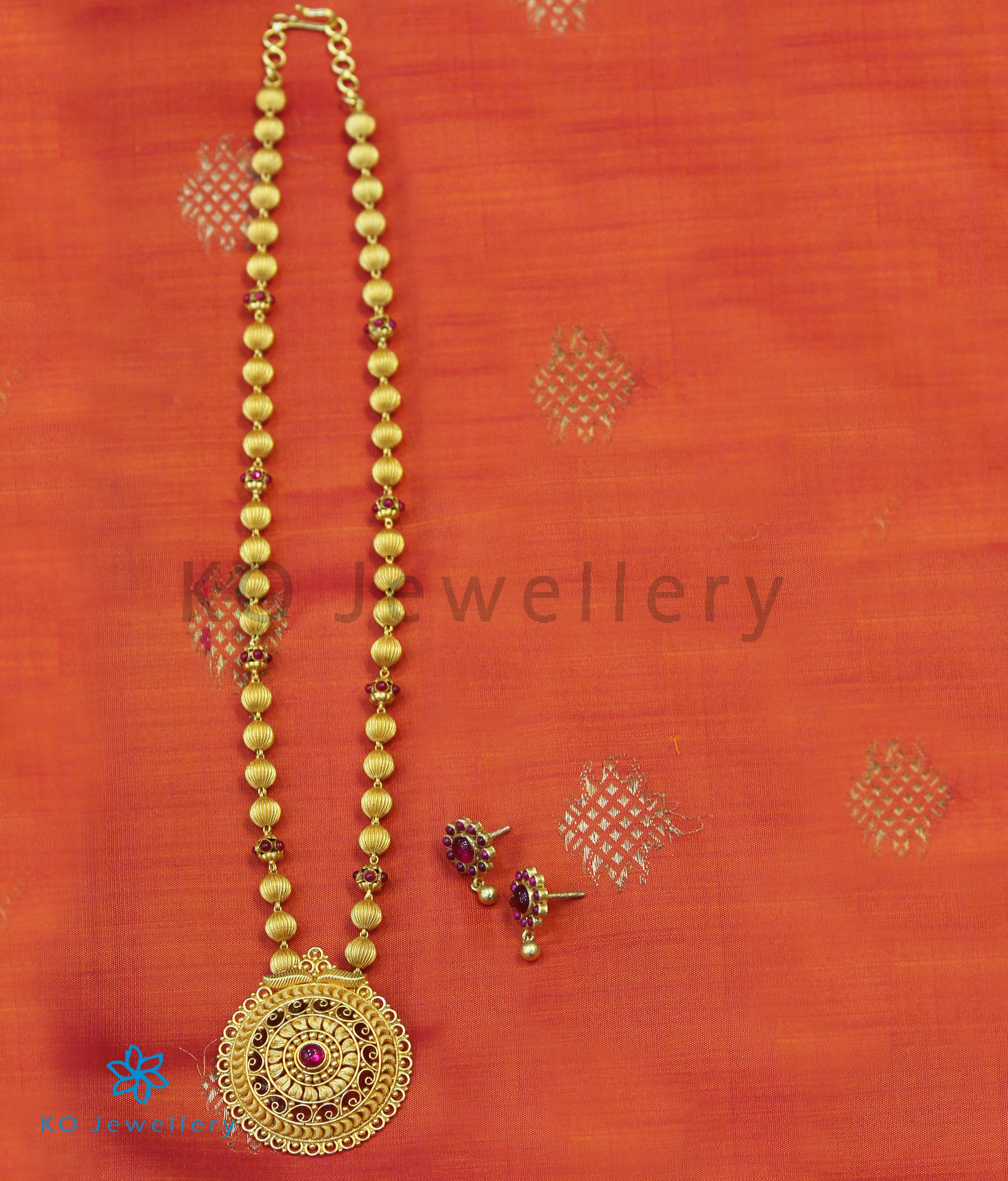 An intricate long necklace from our antique temple jewellery collection. The pendant and earrings have been handcrafted with fine filigree work the red stones add to its beauty.The pendant is hung on a chain made of gold-dipped, silver beads handwoven in silver wire.The entire piece is crafted in pure Sterling Silver (92.5%) and dipped in 24 karat gold.It comes with matching ear-studs.