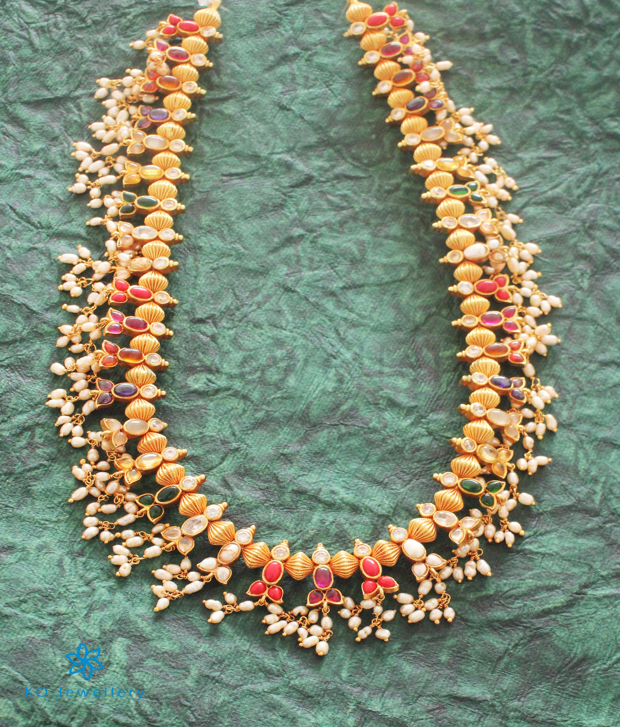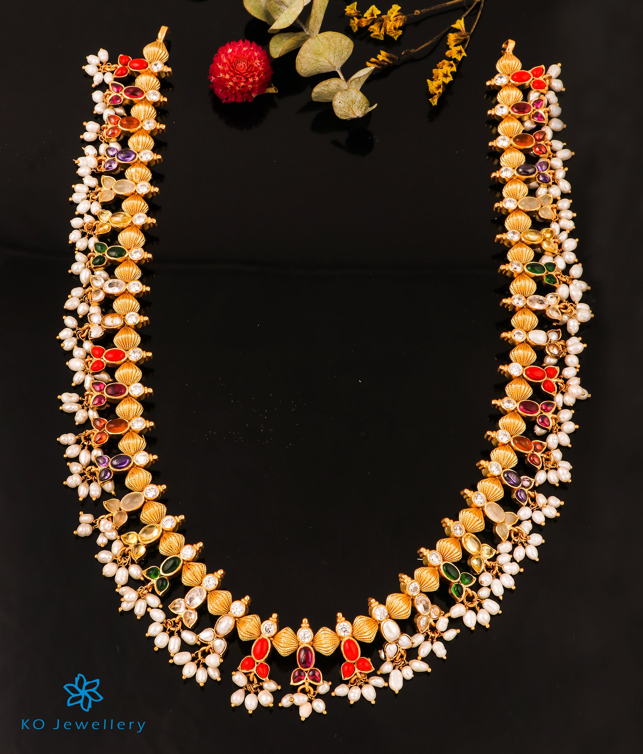 Catch everyone's attention with this beautiful Sterling Silver (92.5%) navratna or nine-gems necklace decorated with Pearls, which will match any oufit. Crafted using techniques used in ancient South Indian antique gold temple jewellery the entire piece is crafted in pure silver.