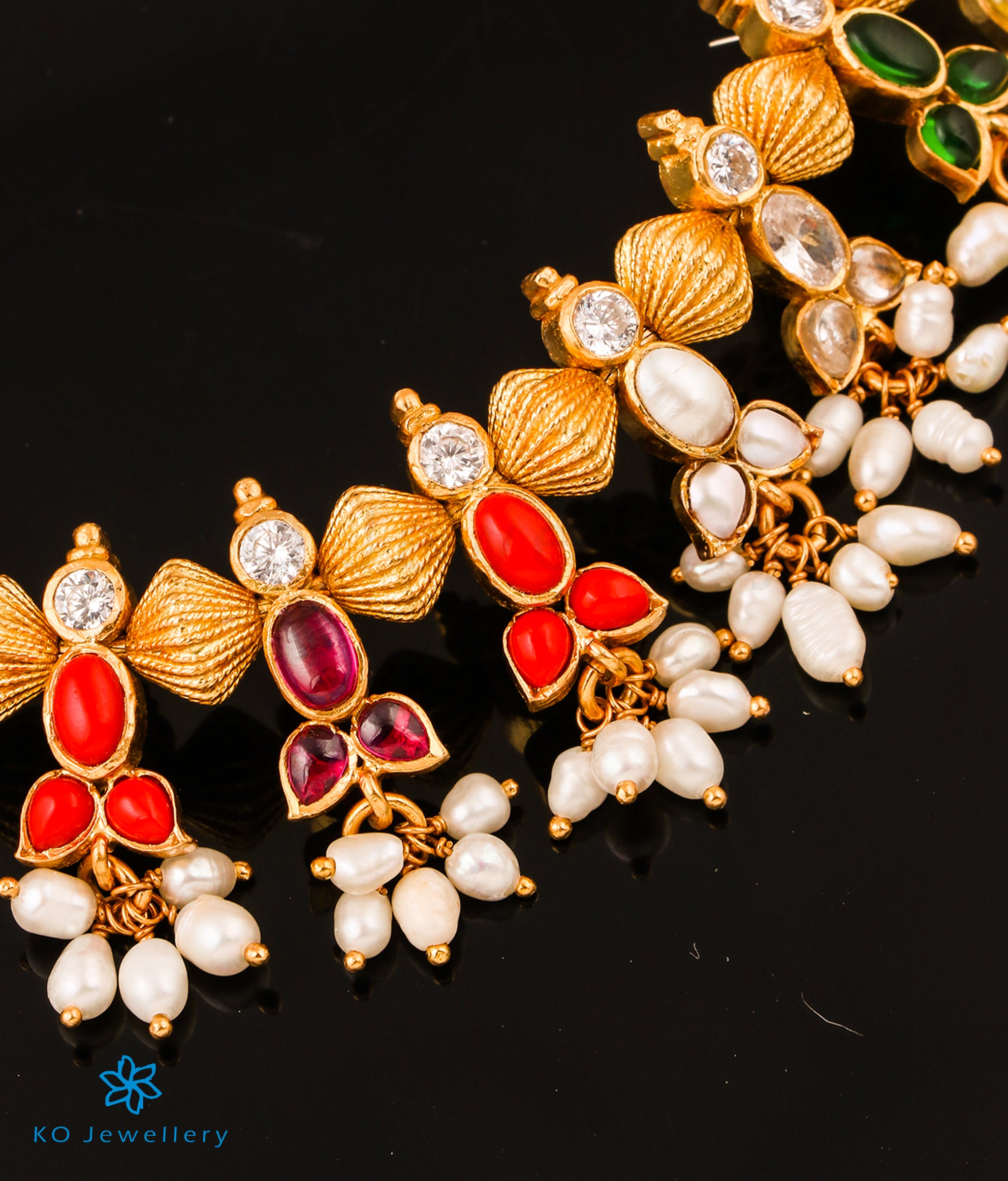 Gemstones used: Natural pearl, Cat's eye, Garnet, Recreated Coral,Zircon,kempu stone (also known as spinel or Zircon).