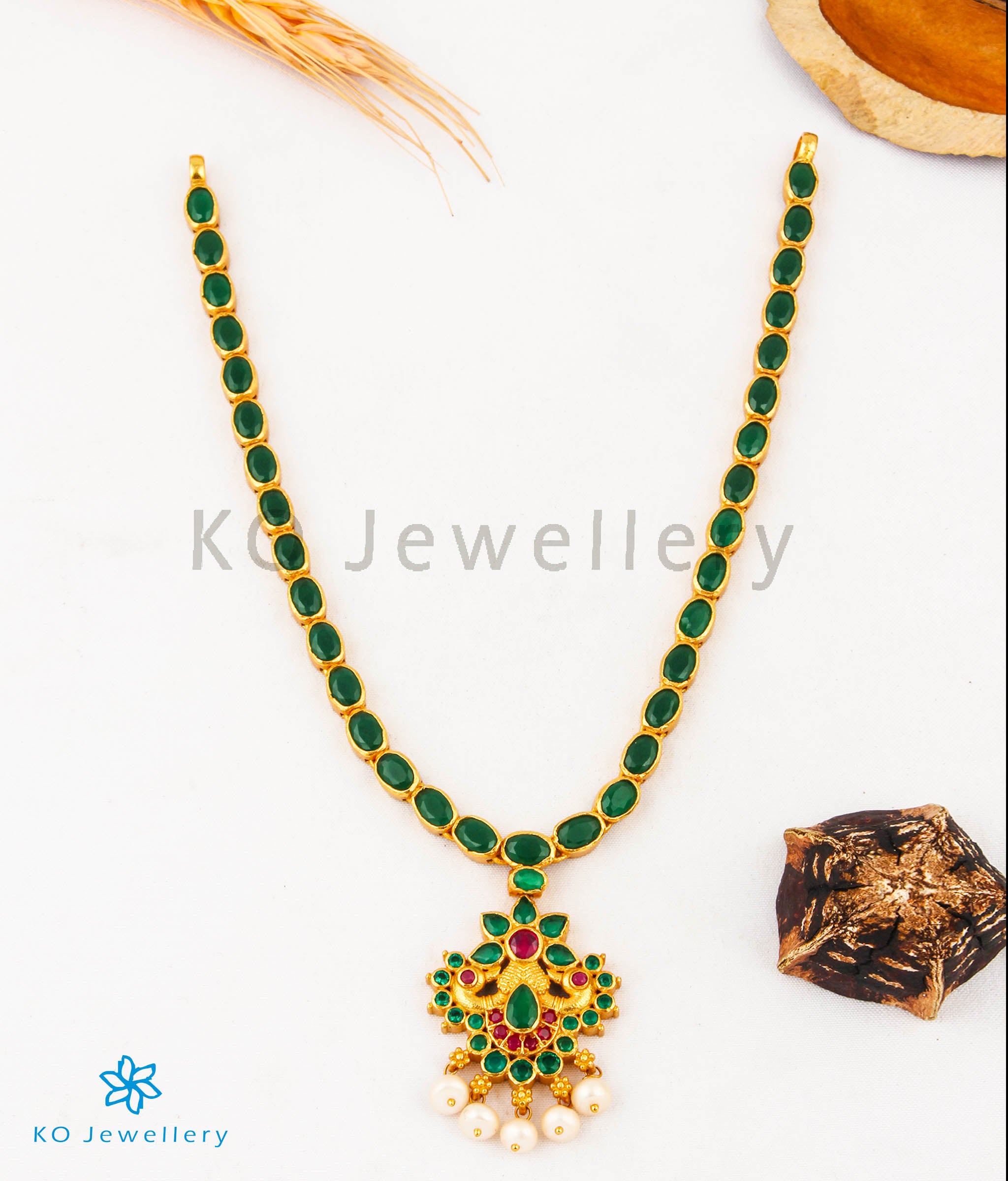 An attractive handcrafted Sterling Silver (92.5%) necklace studded with green kempu stones the pendant of this necklace is topped by twin peacocks and an intricate design of kempu stones.
