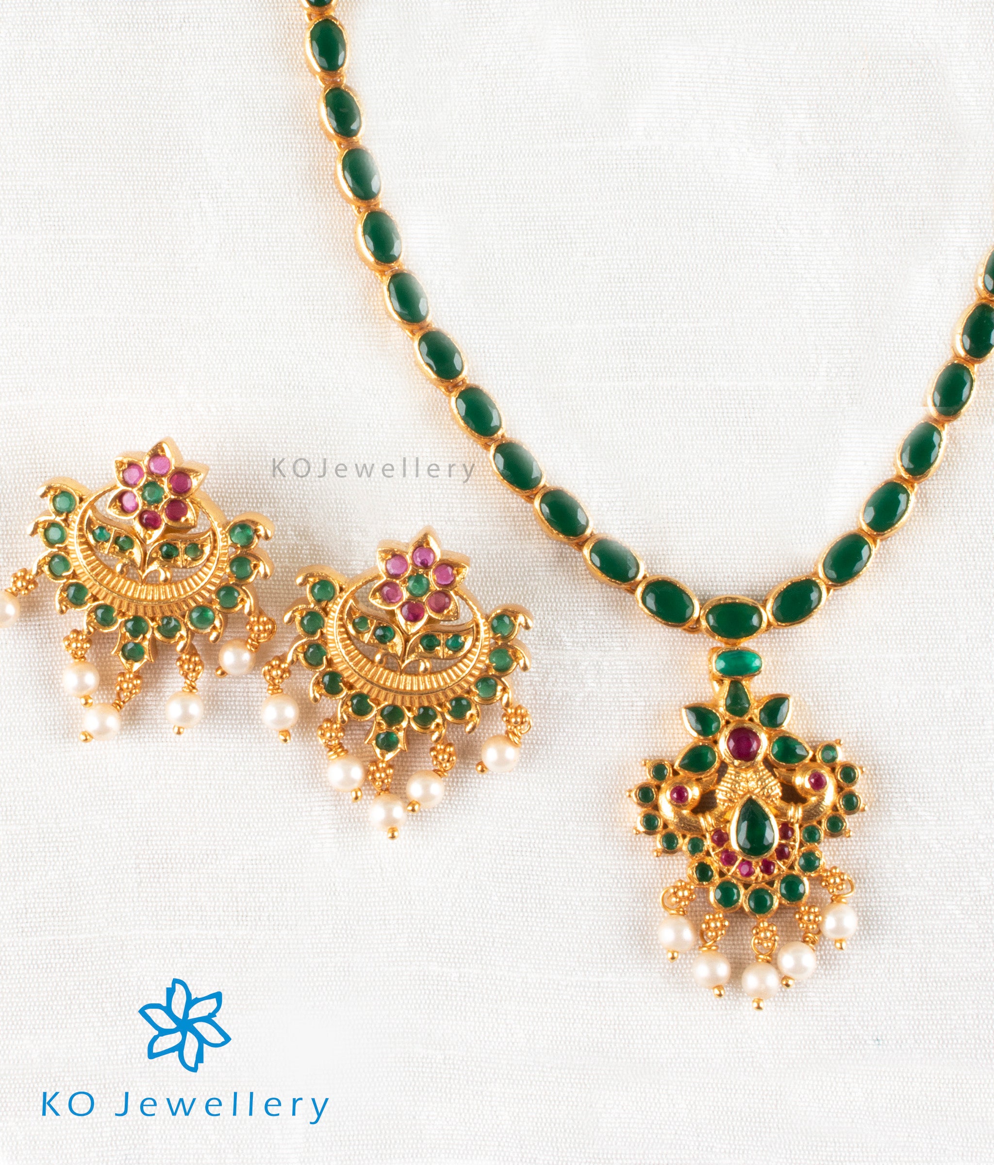 Handcrafted using techniques used in ancient South Indian antique jewellery it is gold-dipped in a special process to give an antique look. It is paired with a beautiful pair of matching ear-studs.