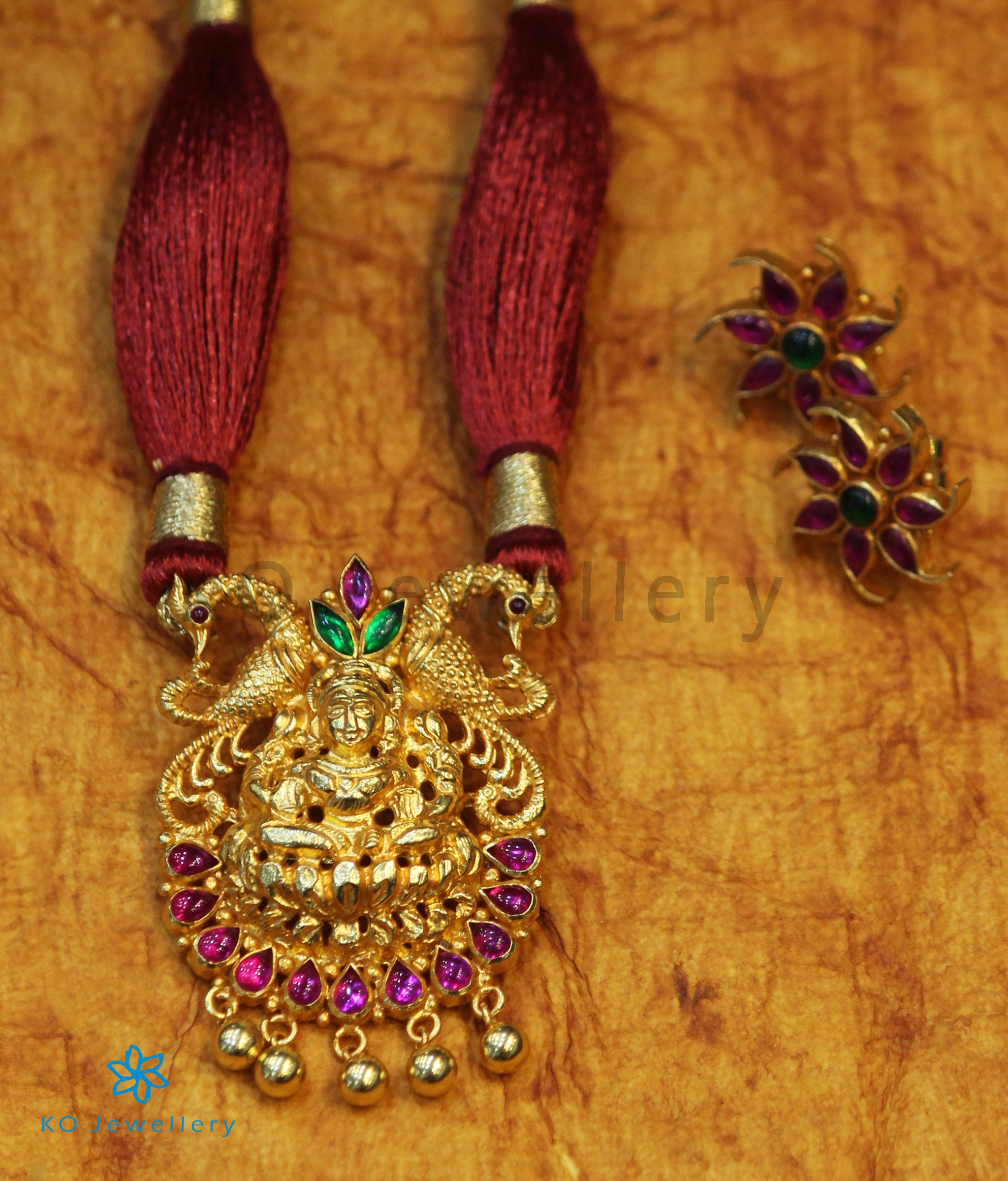 This is a traditional Lakshmi pendant with `nakkasi' or `nakshi' work (a form of gilt and repousse technique unique to south Indian temple jewellery).The Goddess is flanked by two peacocks on her side. All pieces in this collection are crafted in Sterling (92.5) Silver and gold dipped in a special process to give them an antique look. The necklace has been paired with matching kempu-stone earstuds.