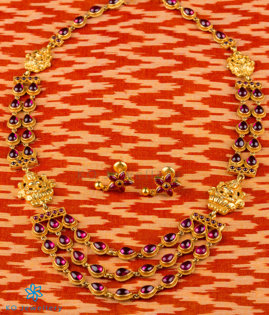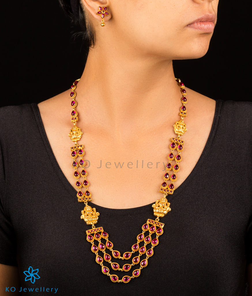The beautiful goddess Lakshmi adorns this necklace which is decorated with tear-drop shaped kempu stones. Handcrafted in Sterling Silver (92.5%) this layered necklace will make a stunning accessory when paired with any outfit.