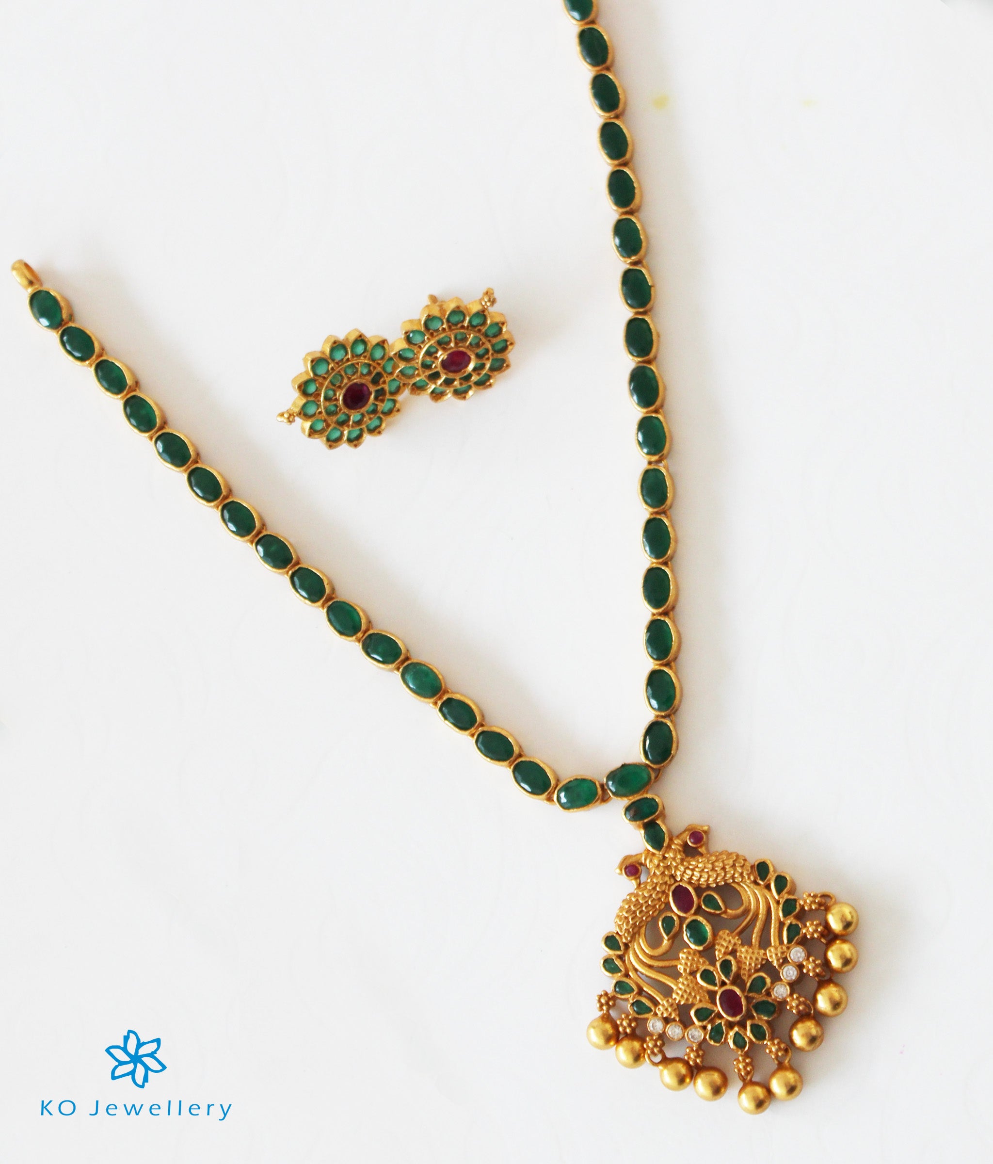 Handcrafted using techniques used in ancient South Indian antique jewellery it is gold-dipped in a special process to give an antique look. It is paired with a beautiful pair of matching ear-studs.