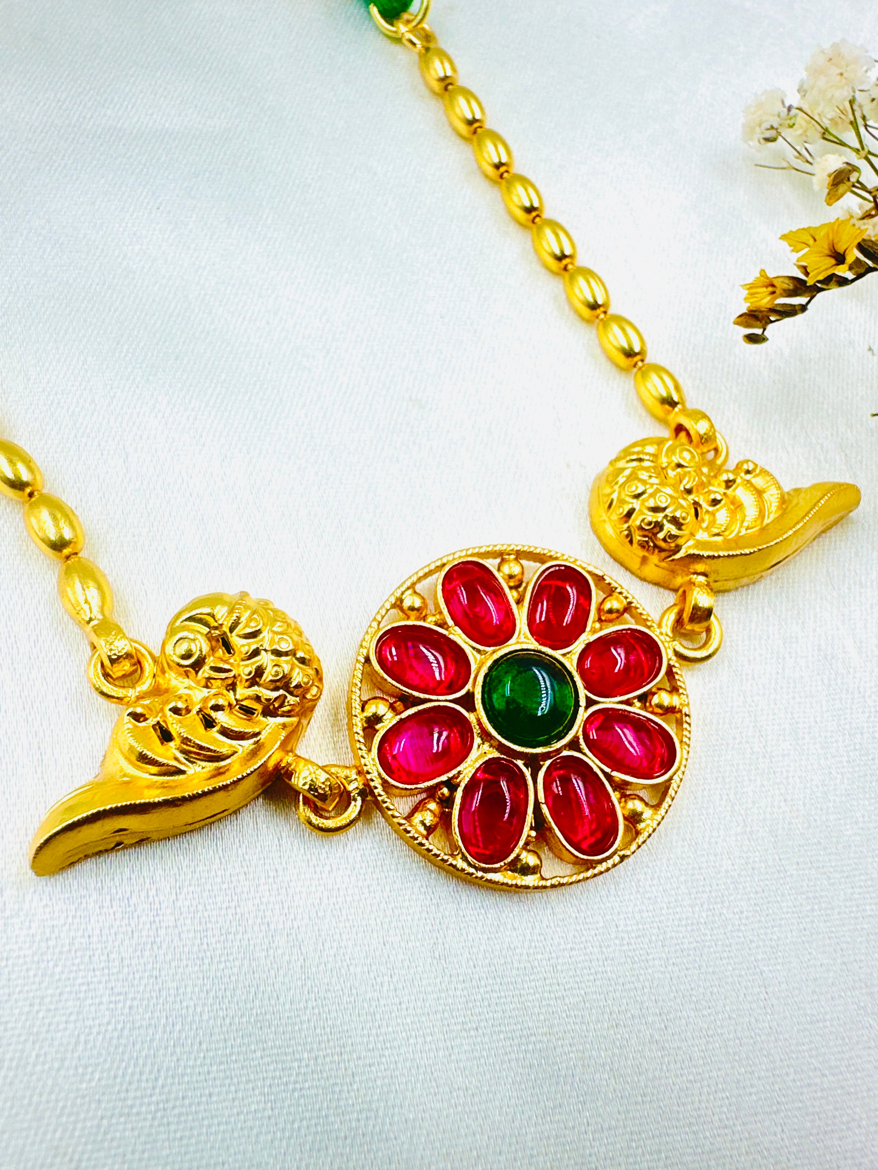 An ornate necklace with brilliant premium quality kempu stone also known as spinel or Zircon in a closed-setting, this is a versatile necklace that will put you in the limelight. The necklace is crafted in Sterling Silver (92.5%) & gold dipped.