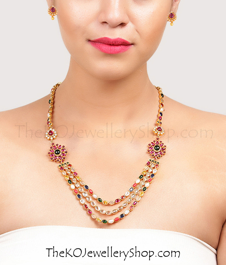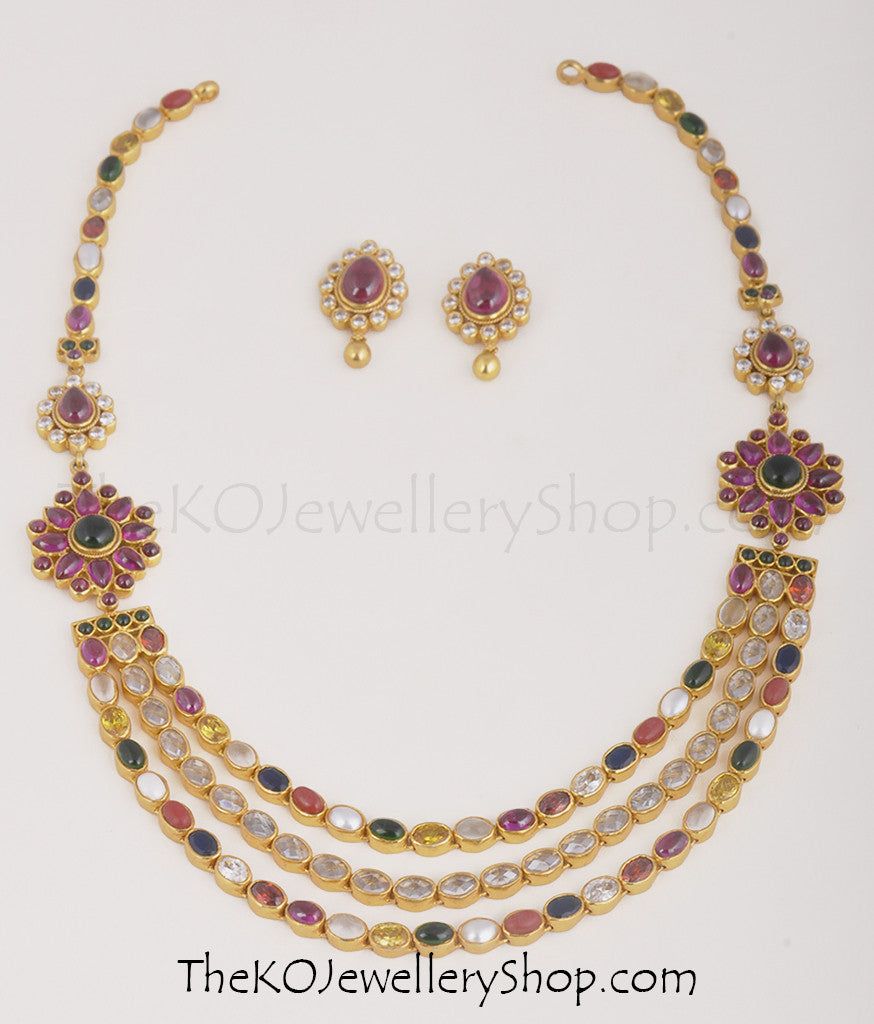 Look stunning in this lovely three layered necklace studded with Navarathna gemstones.The elaborate design is combined with flawless craftsmanship to make it a stunning piece. It comes with a pair of matching ear-studs. All pieces in this collection are crafted in Sterling (92.5) Silver and gold-dipped in a special process to give them an antique look.