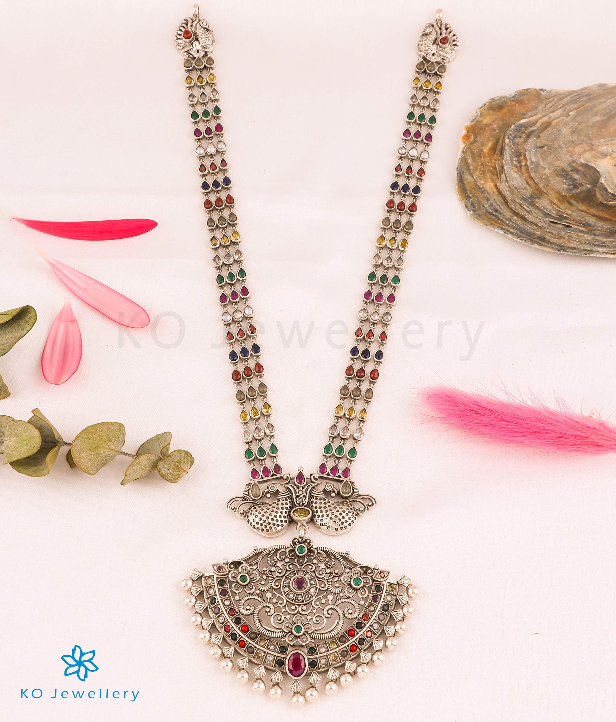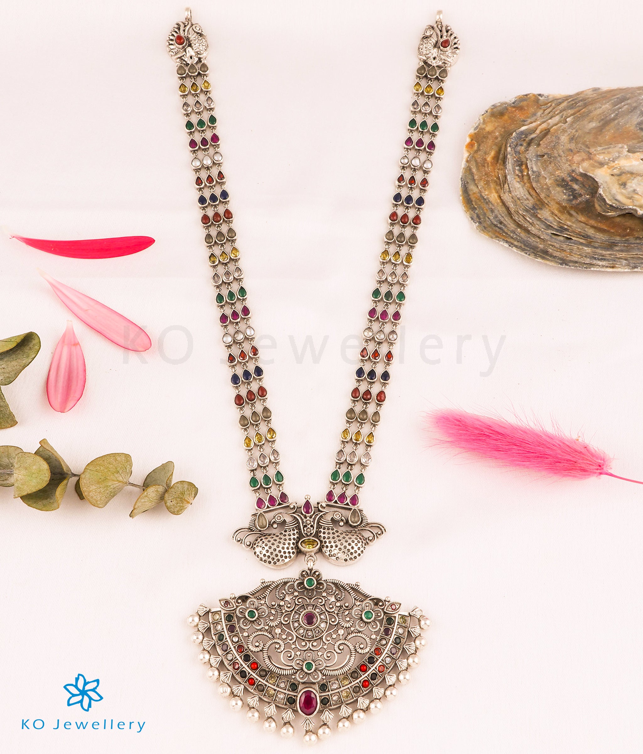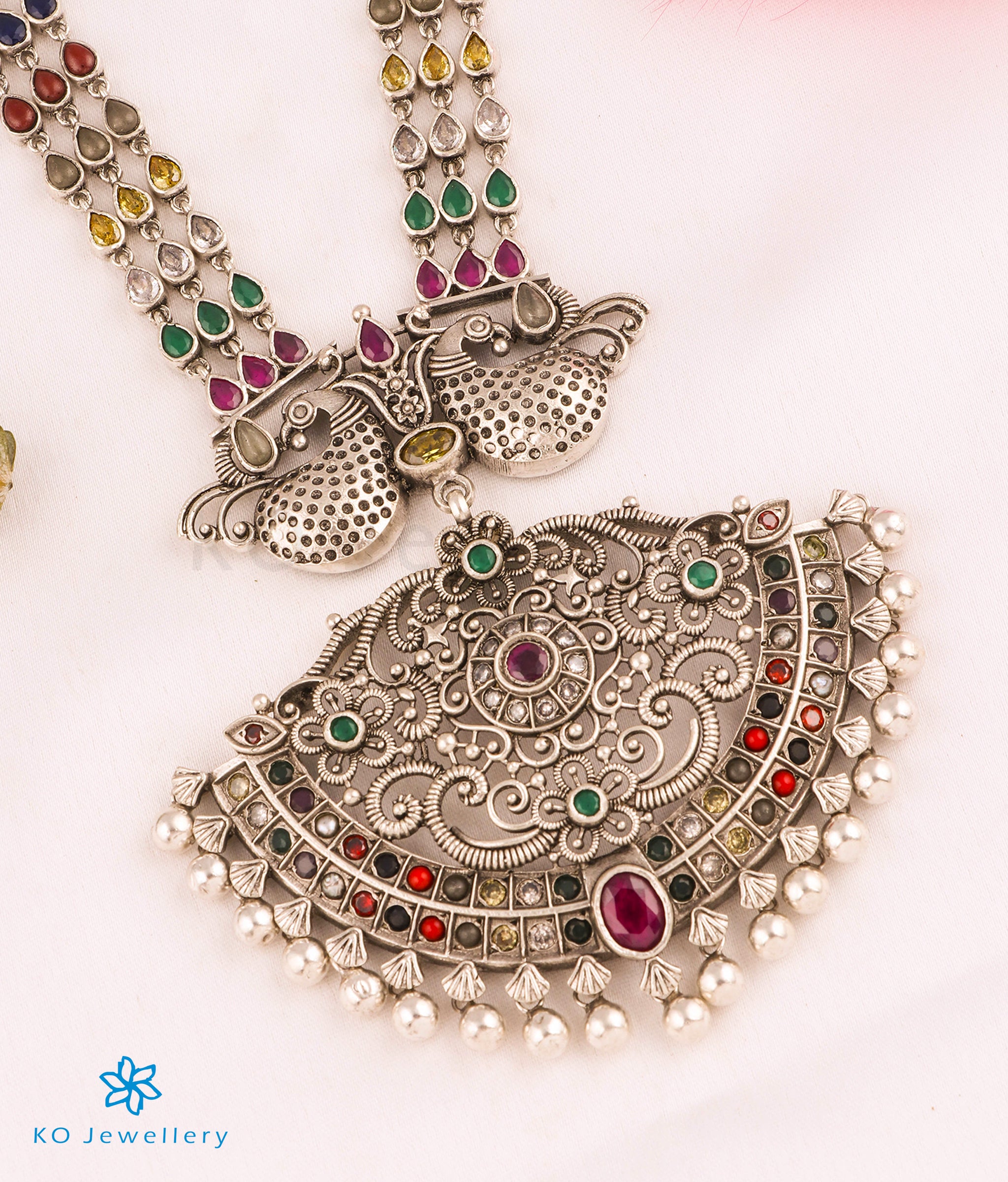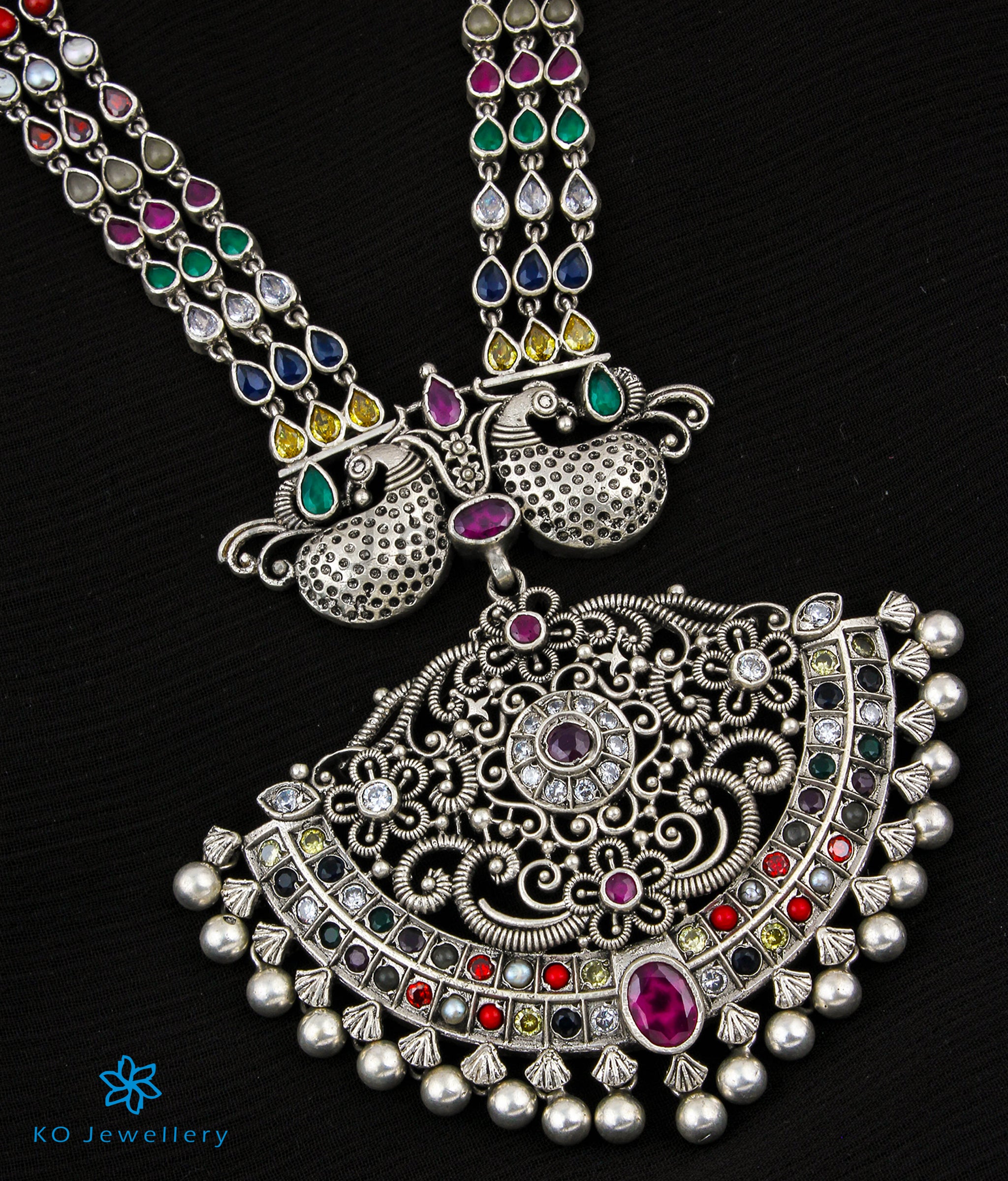 A stunning navartna gemstone necklace in oxidised Sterling Silver (92.5) ; this necklace uses the `Makarakanti' design - a ceremonial necklace worn by kings in ancient times. The pendant has two peacocks etched in fine detail facing each other while the necklace string . Also available in gold-dipped finish on request.