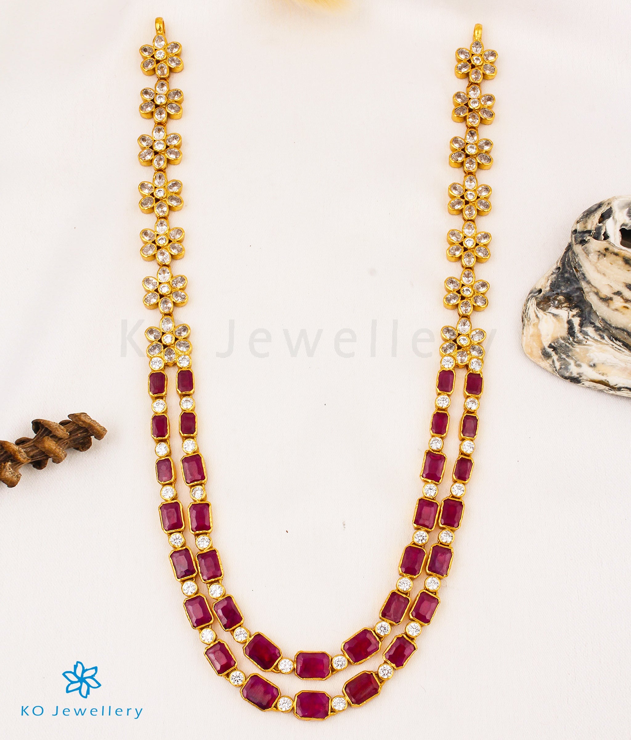Catch everyone's attention with this beautiful Sterling Silver (92.5%) necklace in two layers with red colour stones which will match any oufit.Crafted using techniques used in ancient South Indian antique gold temple jewellery the entire piece is crafted in pure silver and dipped in 24 karat gold.