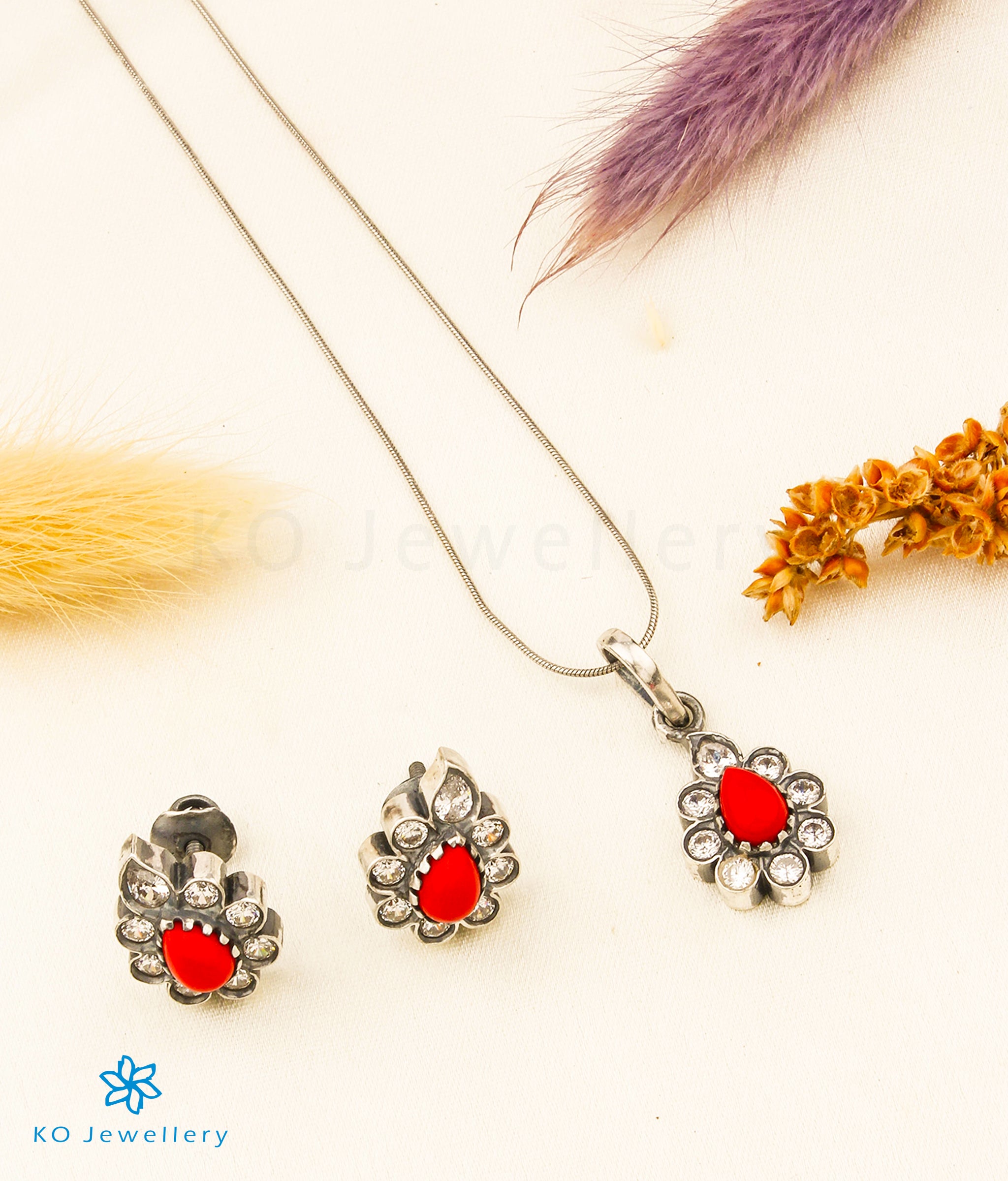 The Bhavika Silver Kemp Pendant Set (Oxidised/Coral)