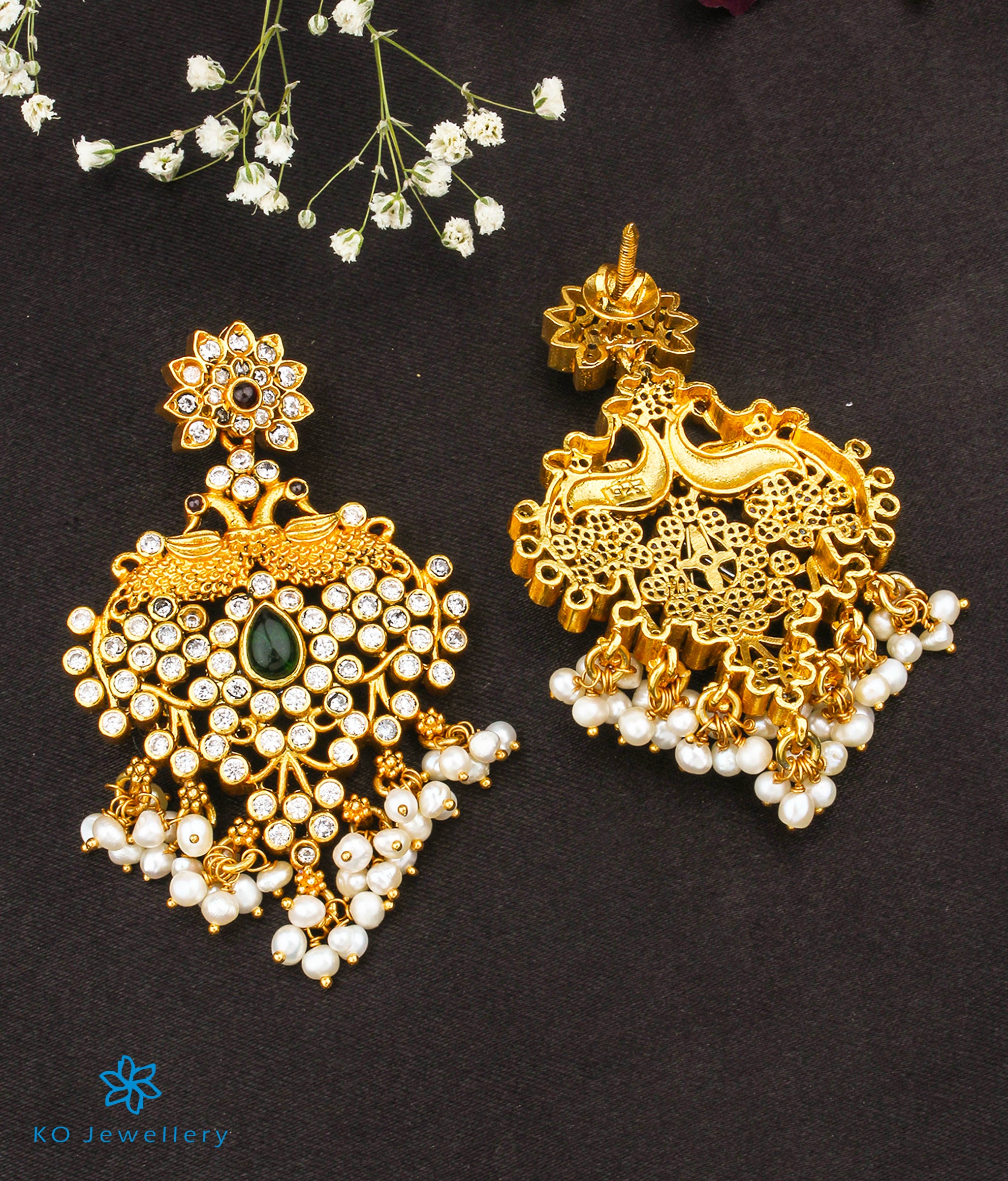 A lovely kemp stone studded pendant in a peacock design. Crafted using techniques used in ancient South Indian antique gold temple jewellery the entire piece is crafted in pure Sterling Silver (92.5%) and dipped in 24 karat gold. The earrings come in screw back (or bombay screw) closure .
