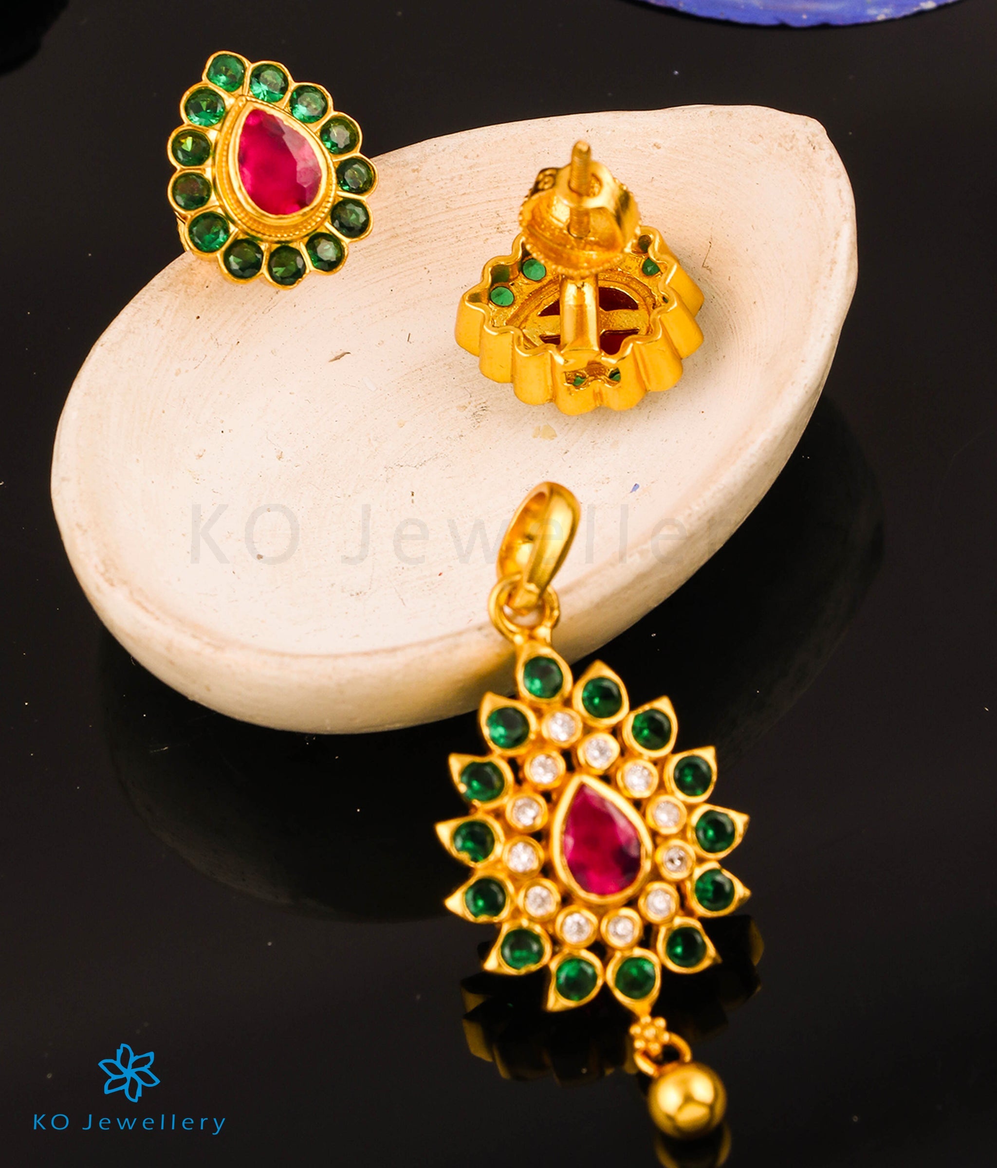 A pretty pendant set with a floral motif studded with kempu stones. Handcrafted using techniques from ancient South Indian antique jewellery this piece displays flawless craftsmanship. All pieces in this set are crafted in Sterling (92.5%) Silver and gold-dipped in a special process to give them an antique look.