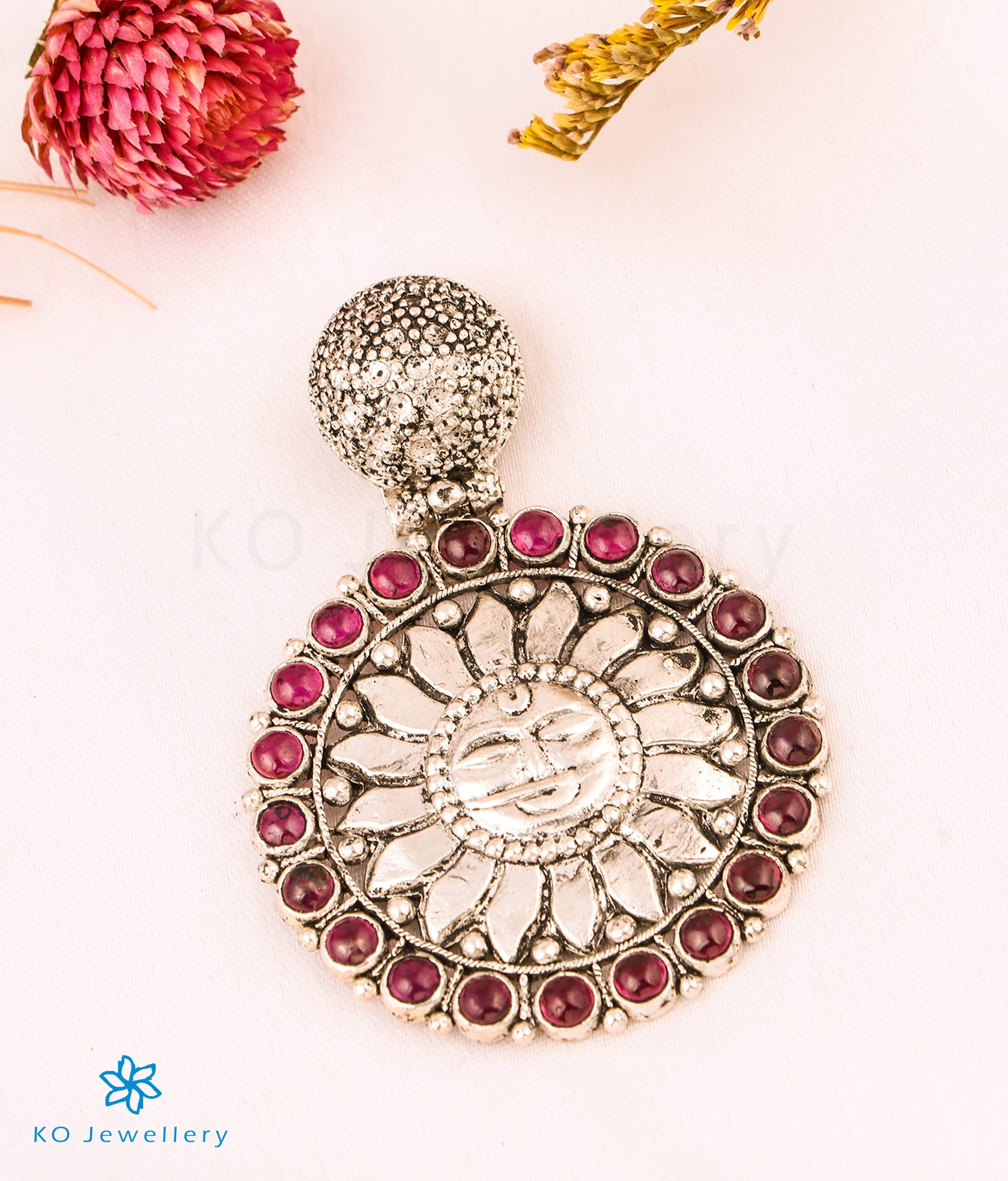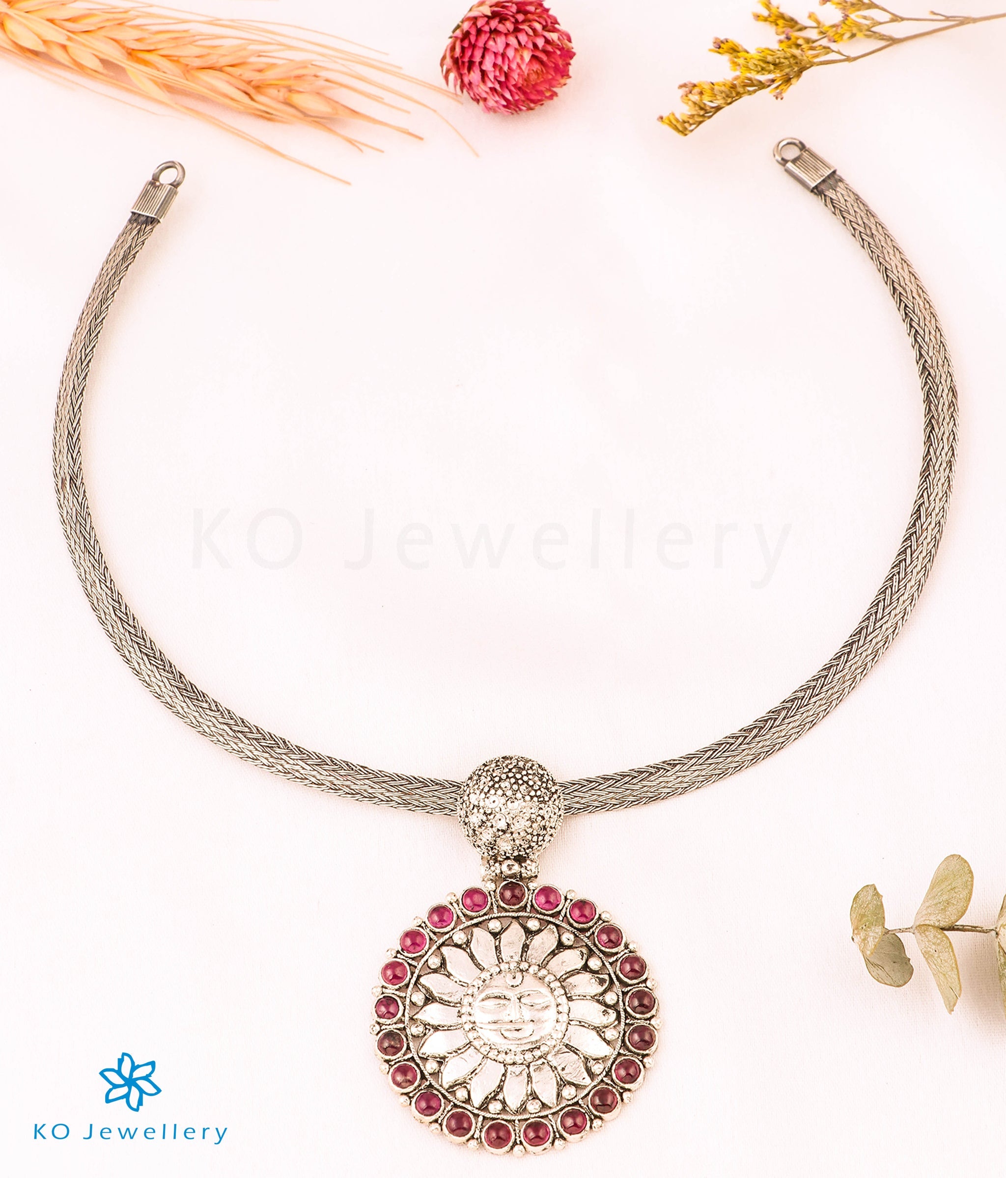 Discover heritage temple jewellery that narrates mythology using ancient motifs , in this gorgeous nakkasi pendant the sun motif is etched beautifully in great detail and decorated with kemp stones. The pendant has been handcrafted in Sterling Silver (92.5%), and oxidised in a special process to give it an antique look.
