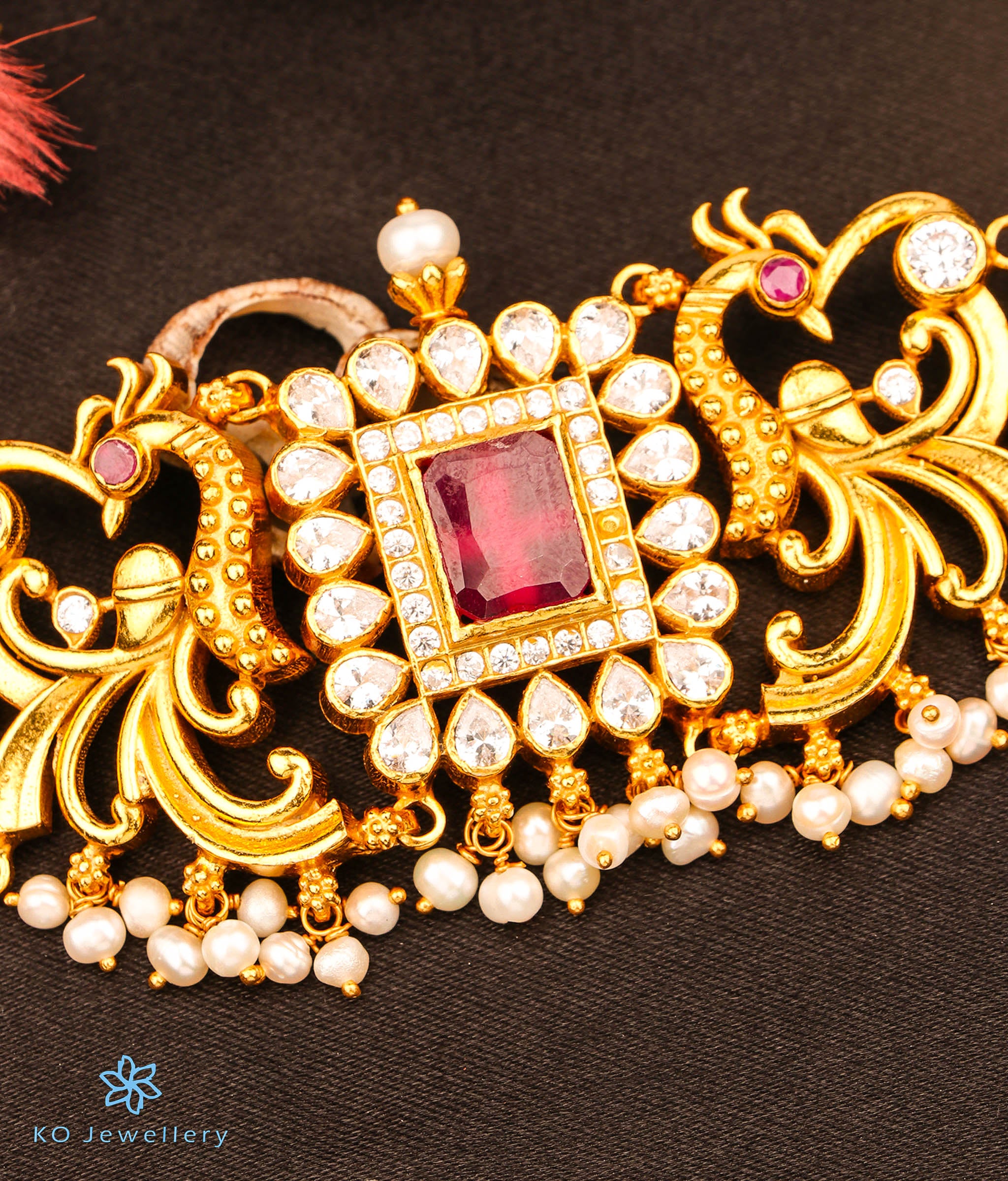 An ornate choker-necklace, this is a versatile piece that can be paired with ethnic attire or sarees. It has a intricate pendant with kempu stones attached to a silver beads chain.This necklace is crafted in Sterling Silver (92.5%) using techniques used in ancient South Indian antique gold temple jewellery.