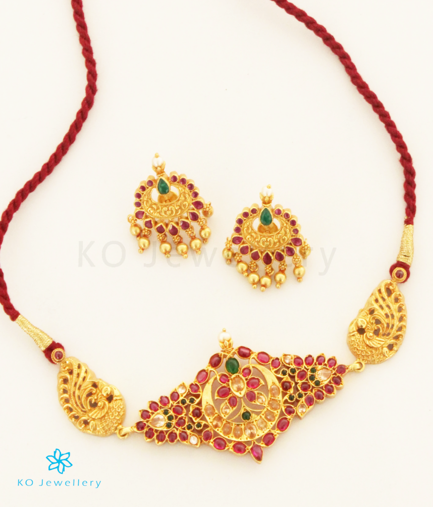 A royal looking and ornate peacock motif choker-necklace, this is a versatile piece that can be paired with ethnic attire or sarees. It has a intricate pendant with kempu stones and two peacocks attached at both ends.This necklace is crafted in Sterling Silver (92.5%) using techniques used in ancient South Indian antique gold temple jewellery.