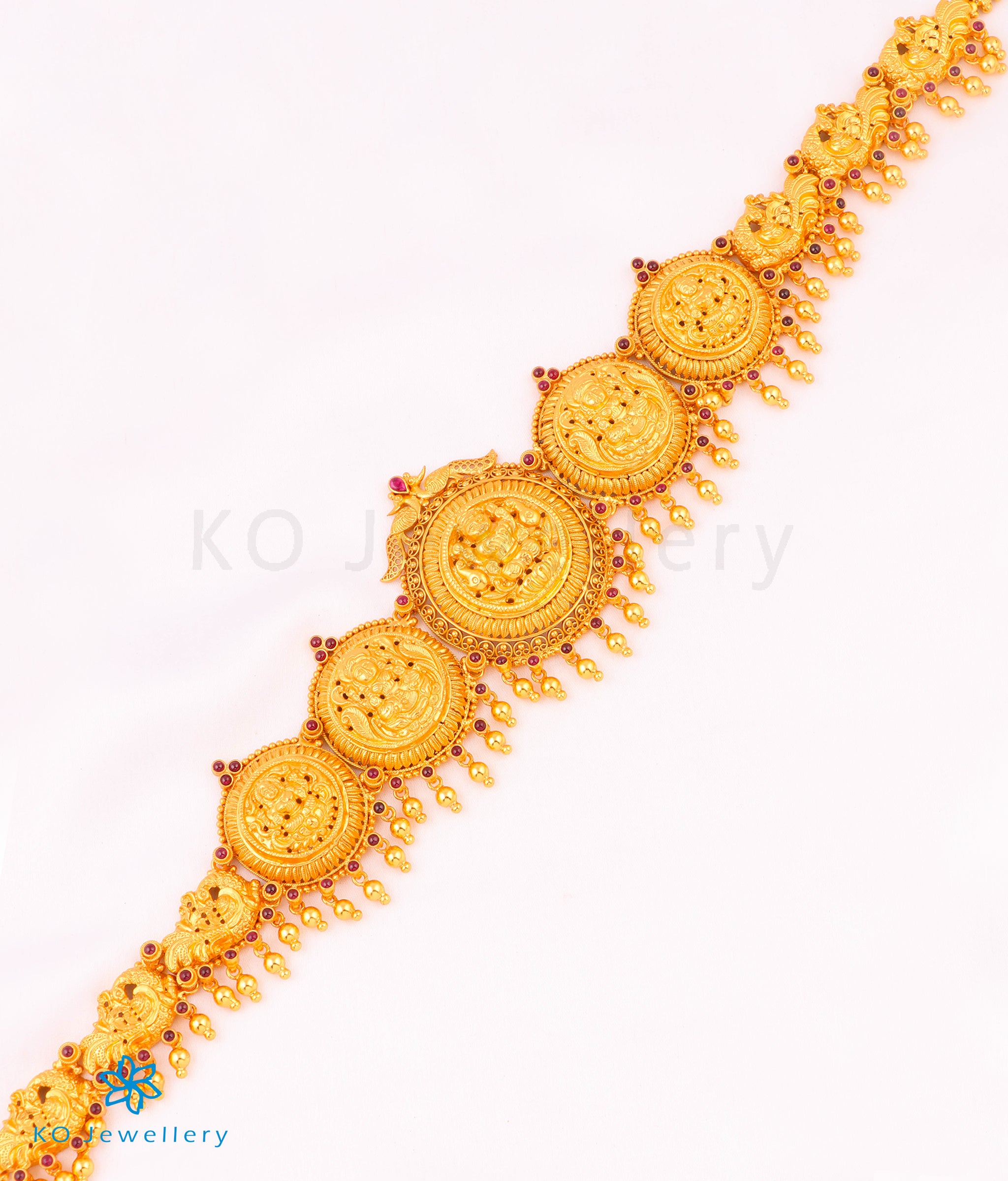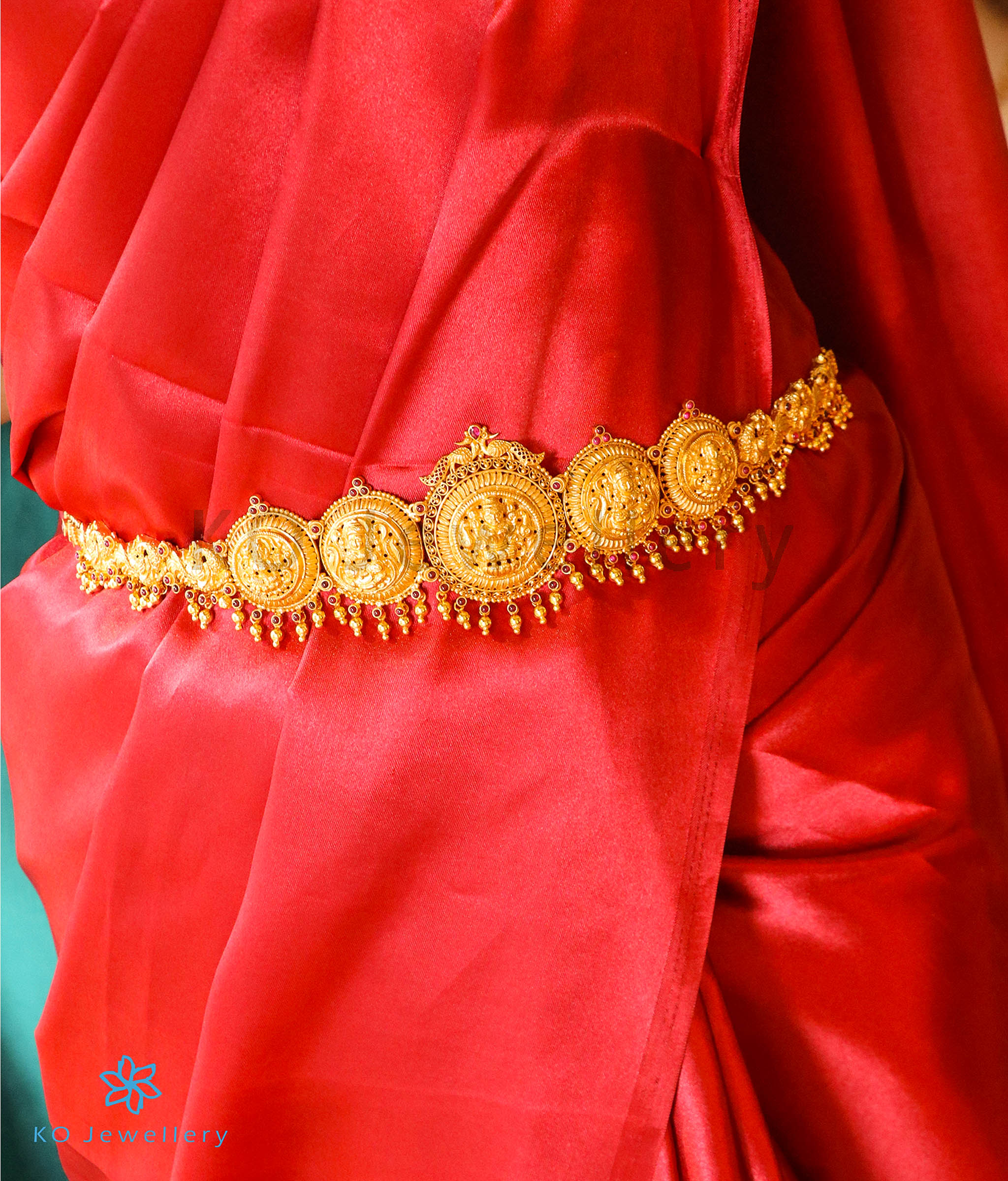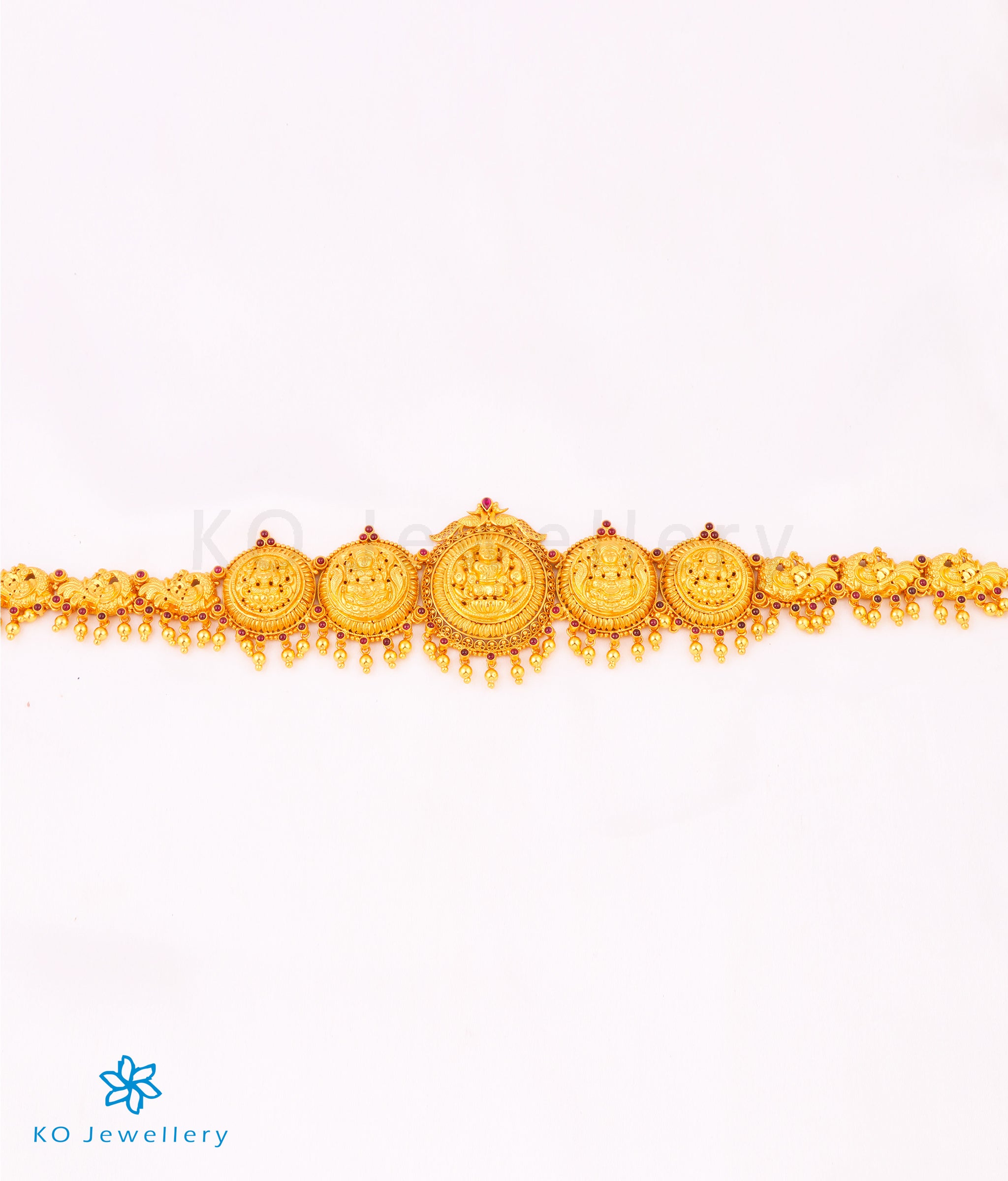 A stunning waist belt handcrafted in a traditional design in Sterling Silver (92.5%) , decorated with five goddess Lakshmi pendants. The Goddess is sitting on a lotus, while plumed peacocks make up the rest of the design.The sheer intricacies of design and flawless craftsmanship make this waist belt handcrafted using the ancient nakkasi technique special.Variously called `Daabu' , `Vaddanam' , `Oddiyanam' or `Sonta patti' the waist belt is an important component of a bride's attire in South India. This waist belt has a chain at the back with links and is adjustable to any waist size.