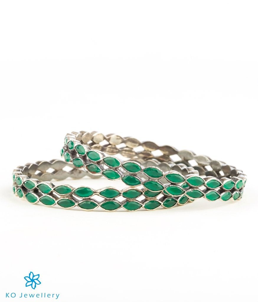 A pretty bangle in an attractive green colour, this makes a great accessory. 'Marquis' shaped green gemstones come together in Sterling Silver (92.5%) to create this exclusive piece. This seamlessly handcrafted bangle can be bought as a single piece or in a pair. The price listed is for a single bangle.