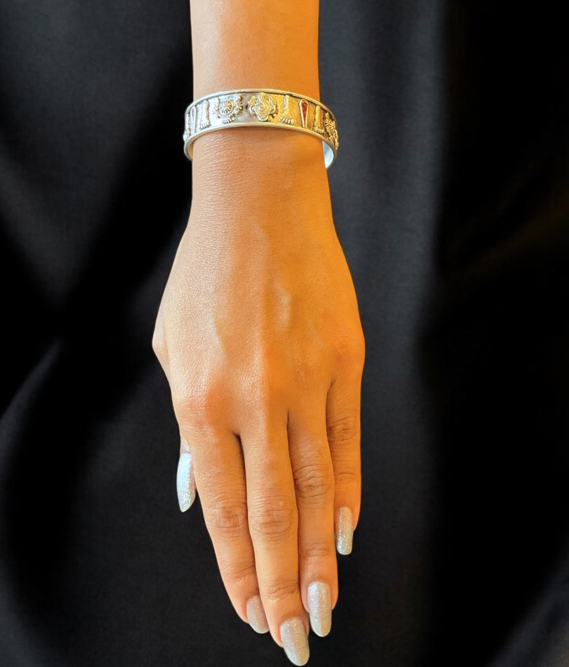 A dramatic Sterling Silver (92.5%) bangle featuring the Vaishnavite symbols of Shankhu, Chakra and Vishnupada on the surface embellished with kemp stones. Adding to the beauty of the piece are handcrafted accents placed on the bangle. Wear this bangle with ethnic wear and make heads turn wherever you go.