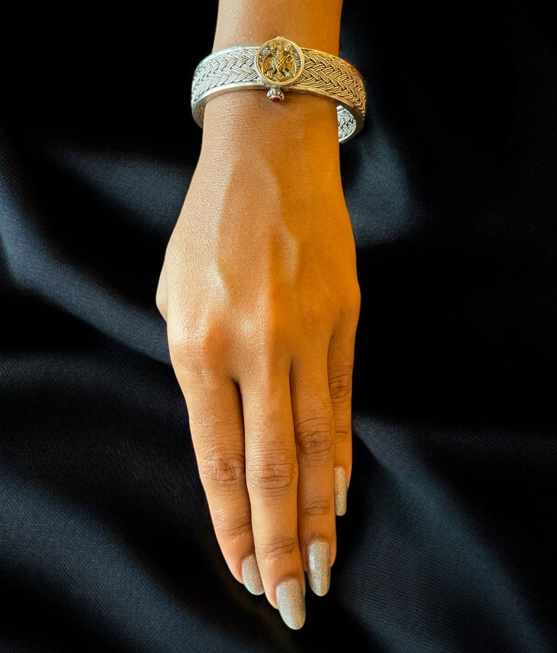 Yet another unique bespoke design from our atelier The Rujuta Gandaberunda Kada is a KO Original design, meticulously handcrafted at our workshop. Here each piece undergoes at least 5-6 distinct processes, with a skilled artisan dedicated to each stage, ensuring unparalleled quality and precision.