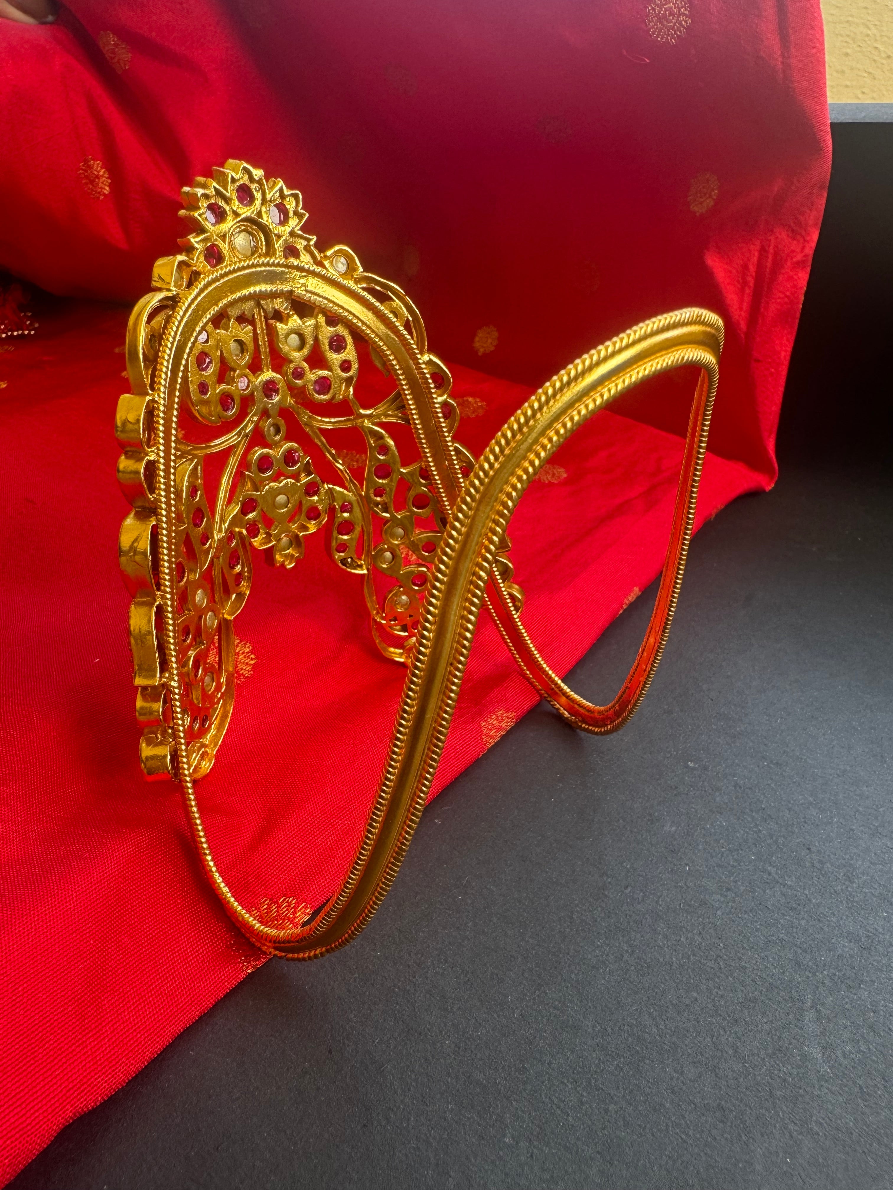 Step into the splendour of tradition with this exquisite Vanki (armband)—a timeless piece of South Indian temple jewellery crafted for the modern bride who cherishes heritage. Featuring a stunning floral motif adorned with radiant kempu stones, this heirloom piece embodies grace, strength, and cultural pride.