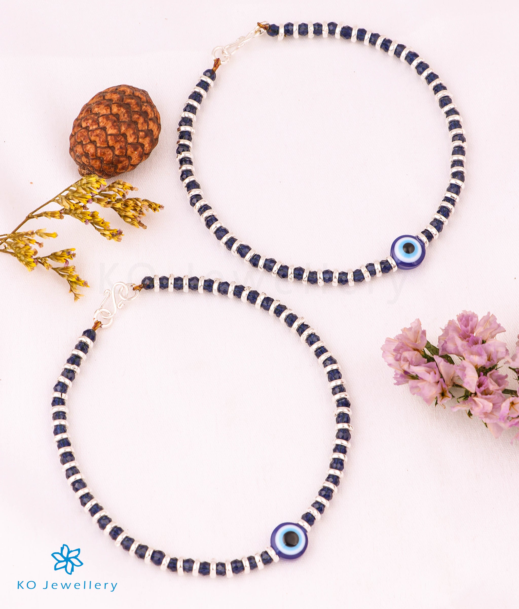 This is a versatile design in Sterling Silver (92.5%) that can be used as either anklets or bracelets according to your choice. This pair is adorned with a evil-eye pendant to ward off the bad luck . Made up of black onyx and silver beads it comes with a strong clasp. Handcrafted to perfection, these anklets pack the miraculous child-friendly properties of pure silver and make for a great gift.