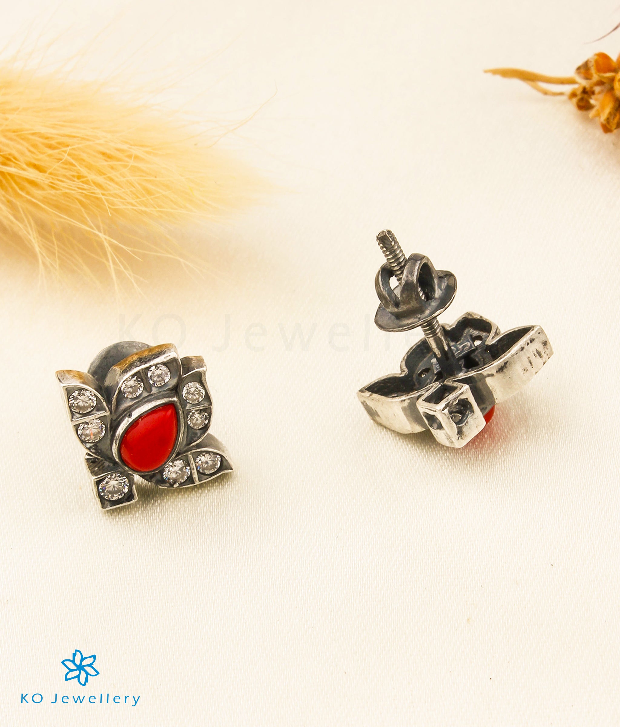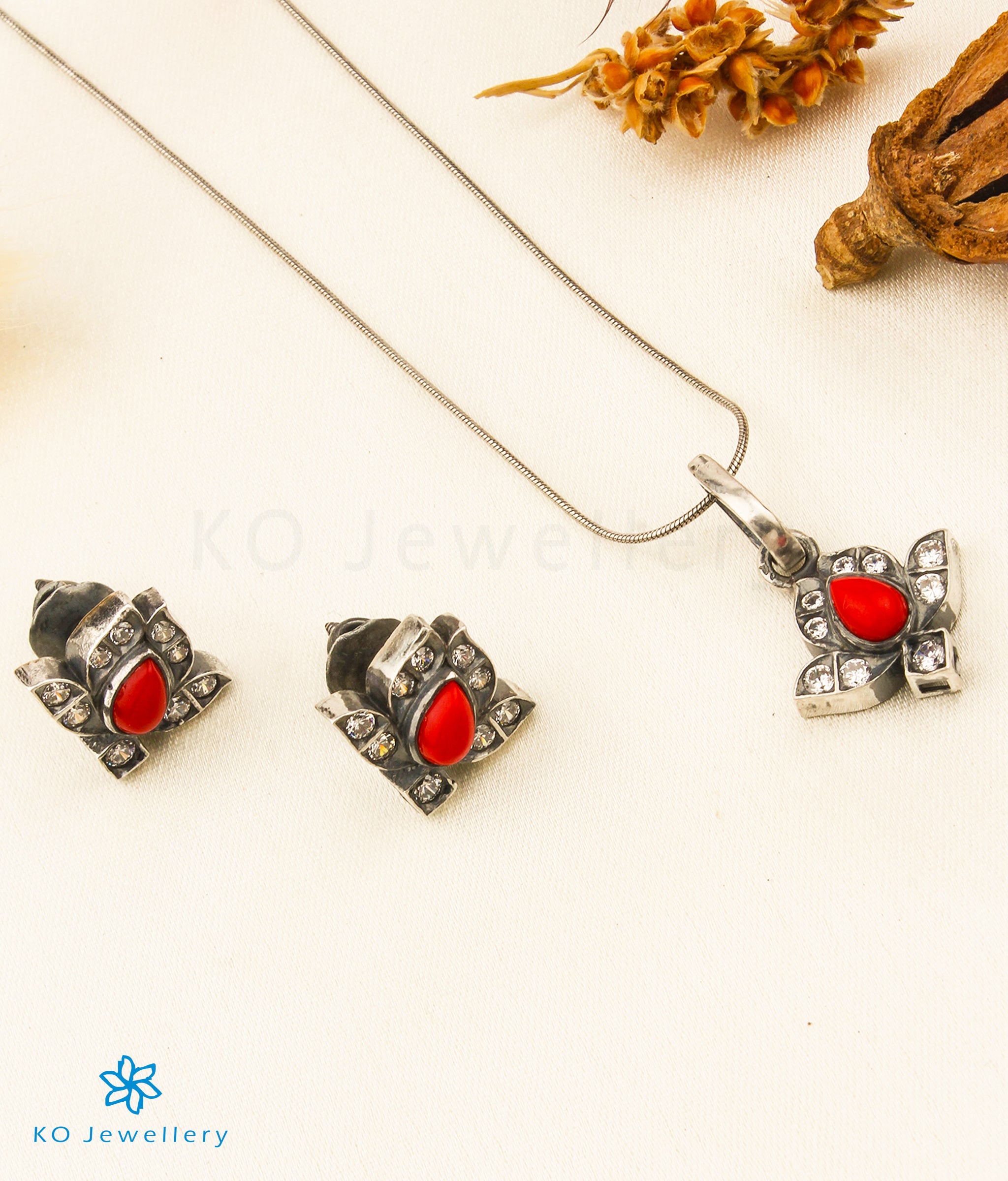 A pretty pendant set with a floral motif studded with kempu stones. Handcrafted using techniques from ancient South Indian antique jewellery this piece displays flawless craftsmanship. All pieces in this set are crafted in Sterling (92.5%) Silver and Oxidised in a special process to give them an antique look. The earrings come with screw-back or bombay screw closure.